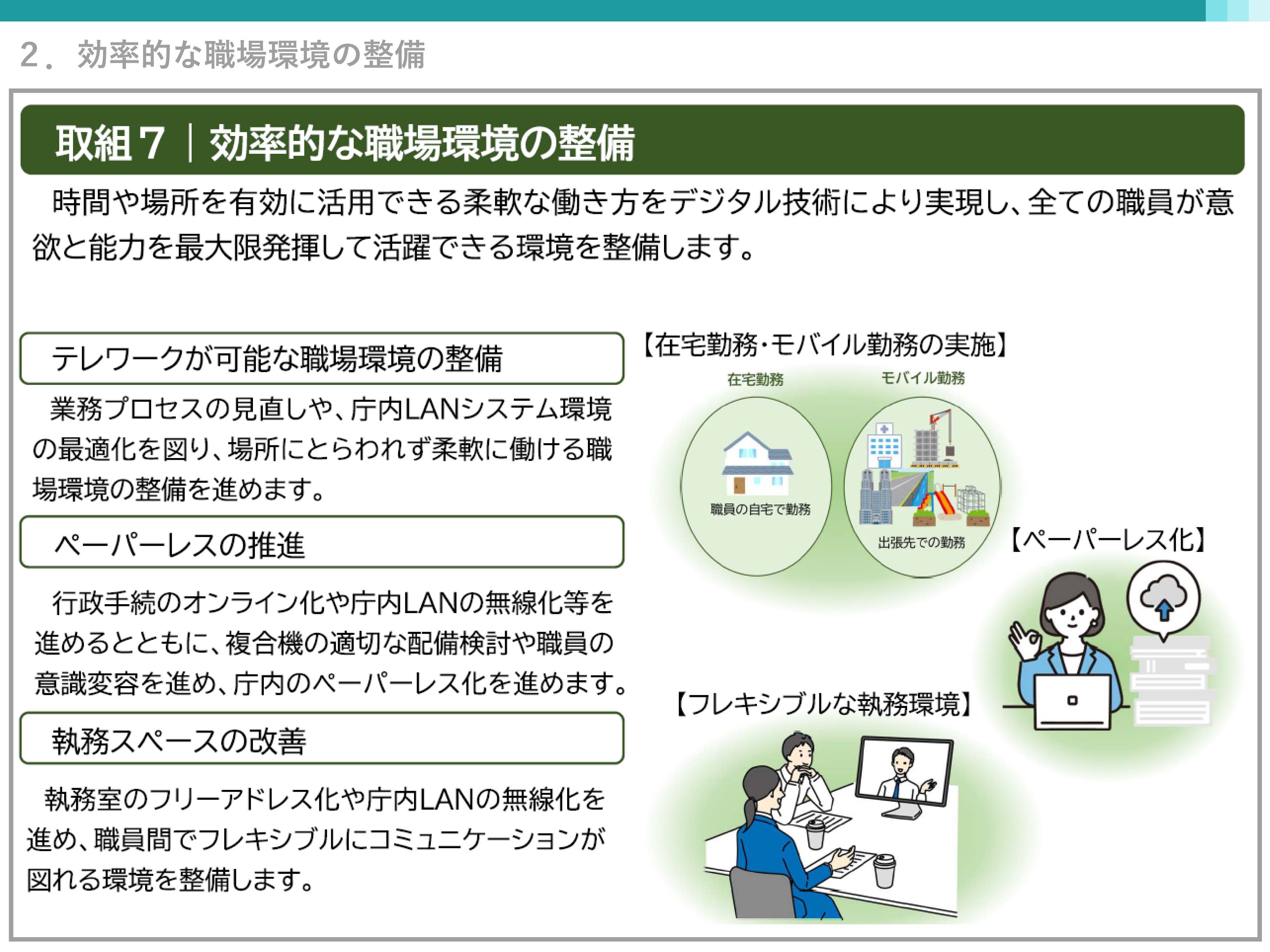 具体的な内容としては、テレワーク端末の数がまだ限定的なので、育児や介護などで、テレワークをしたい・せざるを得ない職員がいつでもテレワークという選択肢をとることができる環境をしっかり準備していくことを進めています。