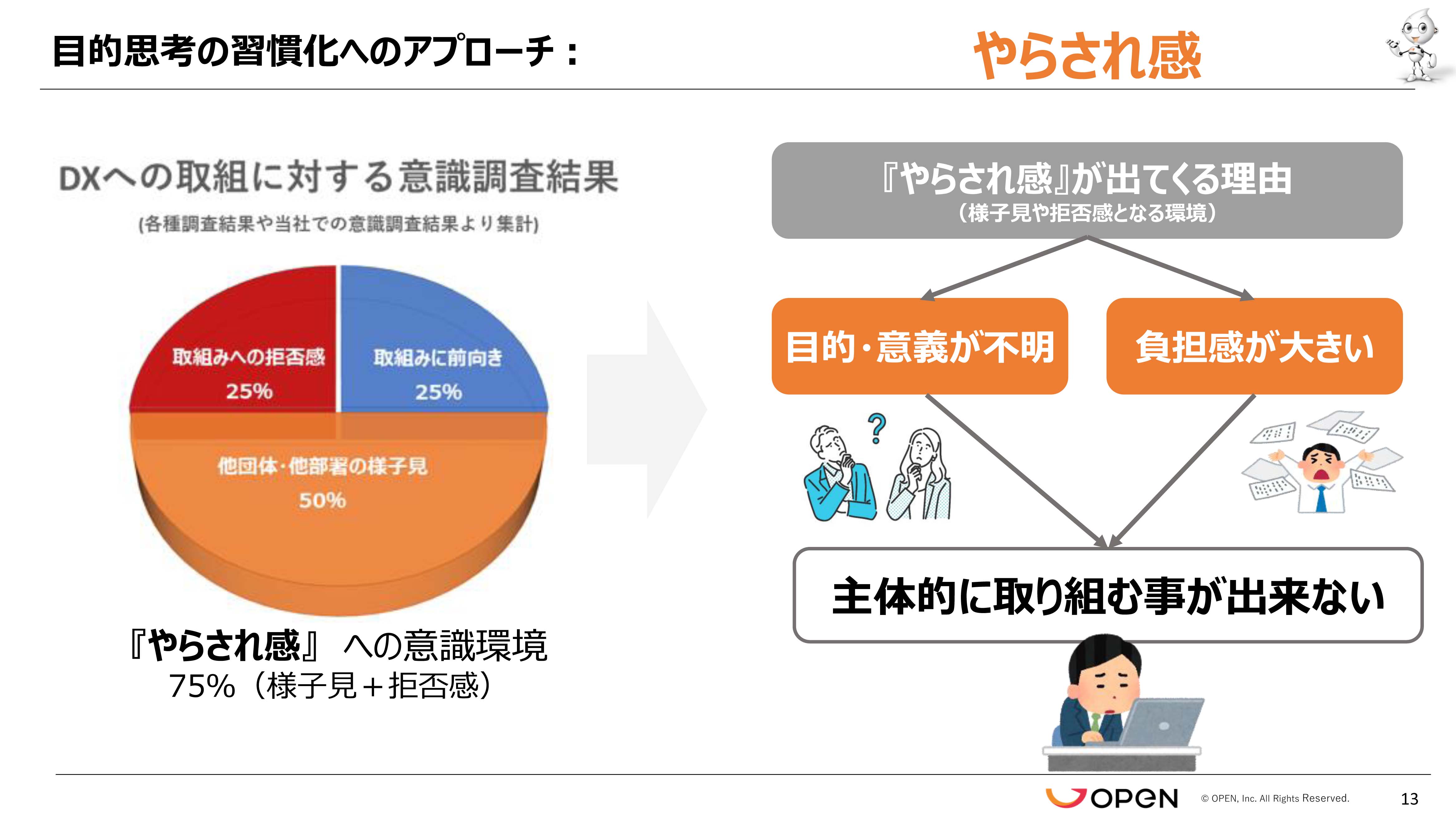 まず、今回のテーマである「やらされ感」について、上図の通り整理しました。これは当社が実施した意識調査などのアンケート結果を集計したものですが、DXに対して前向きな職員は4分の1くらい、という結果になっています。この背景には、DX推進の目的や意義が理解されていない、負担感が大きい、といった面があるようです。