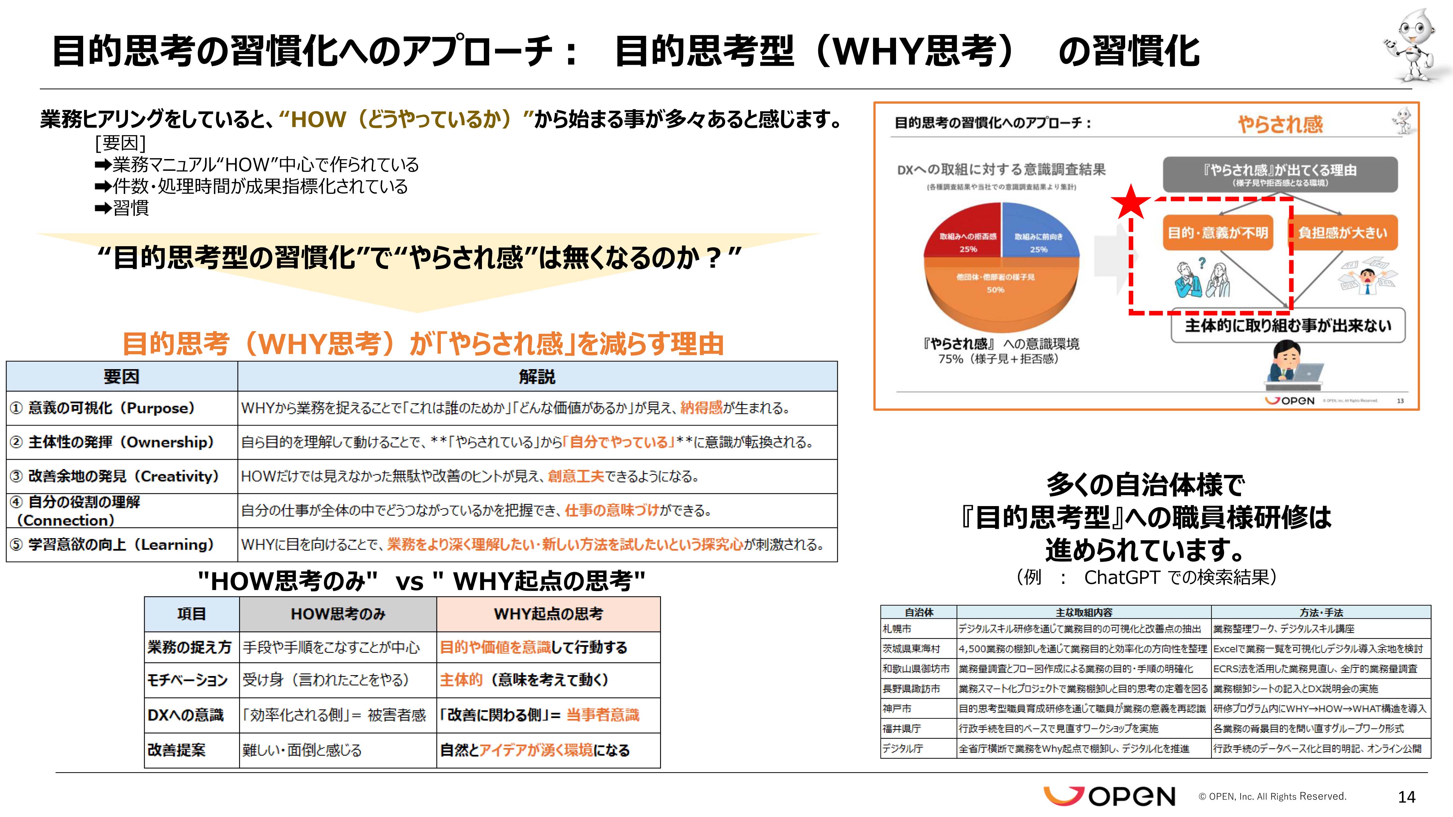 業務について具体的にヒアリングをしていると、“HOW”から始まることが多い、というのが実感です。しかし、必要なのは目的思考型の“WHY”の方だと我々は考えています。何かをやることの意義を可視化し、職員が納得感を持って向き合うことで、主体性が発揮されていくのです。