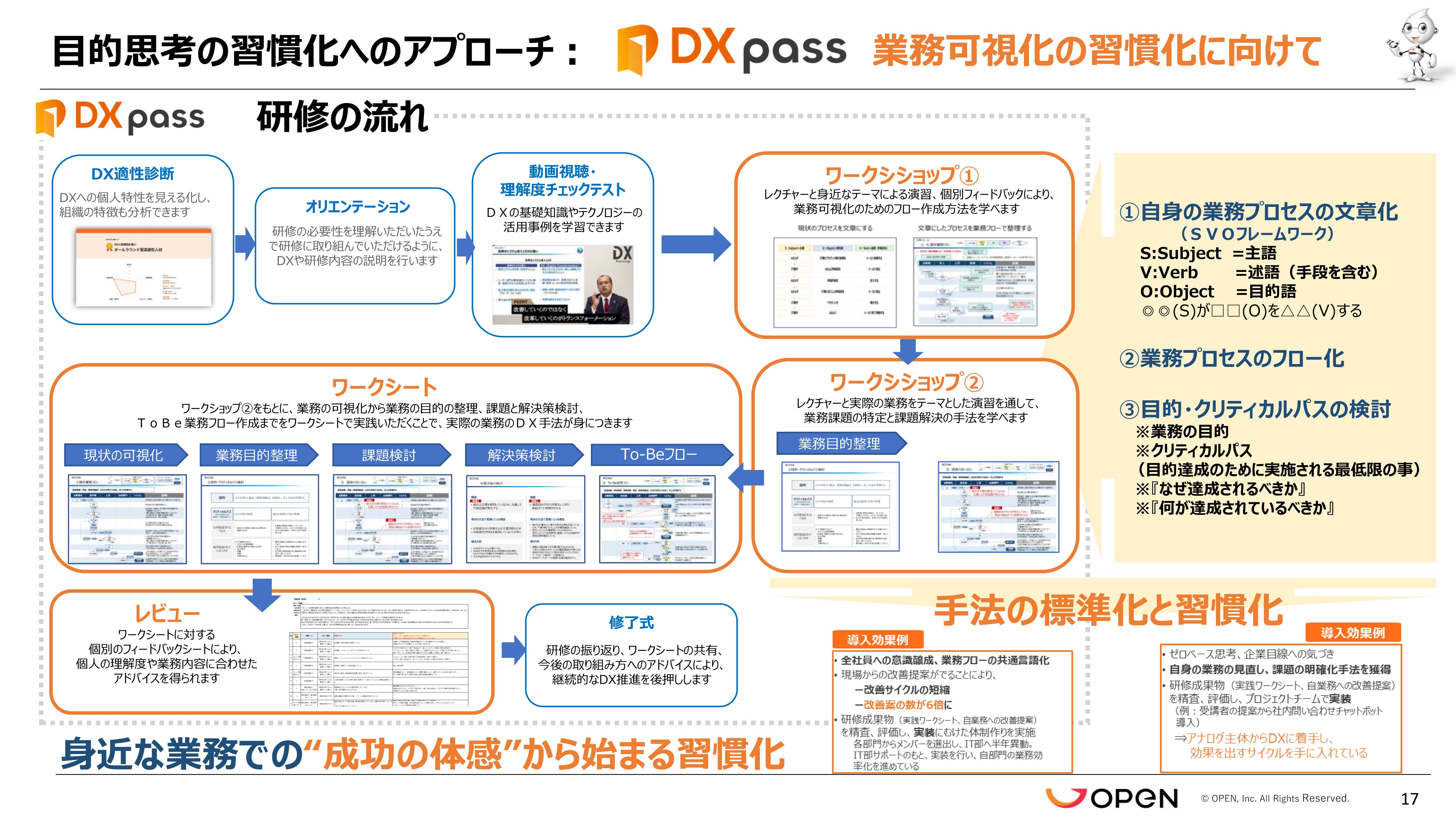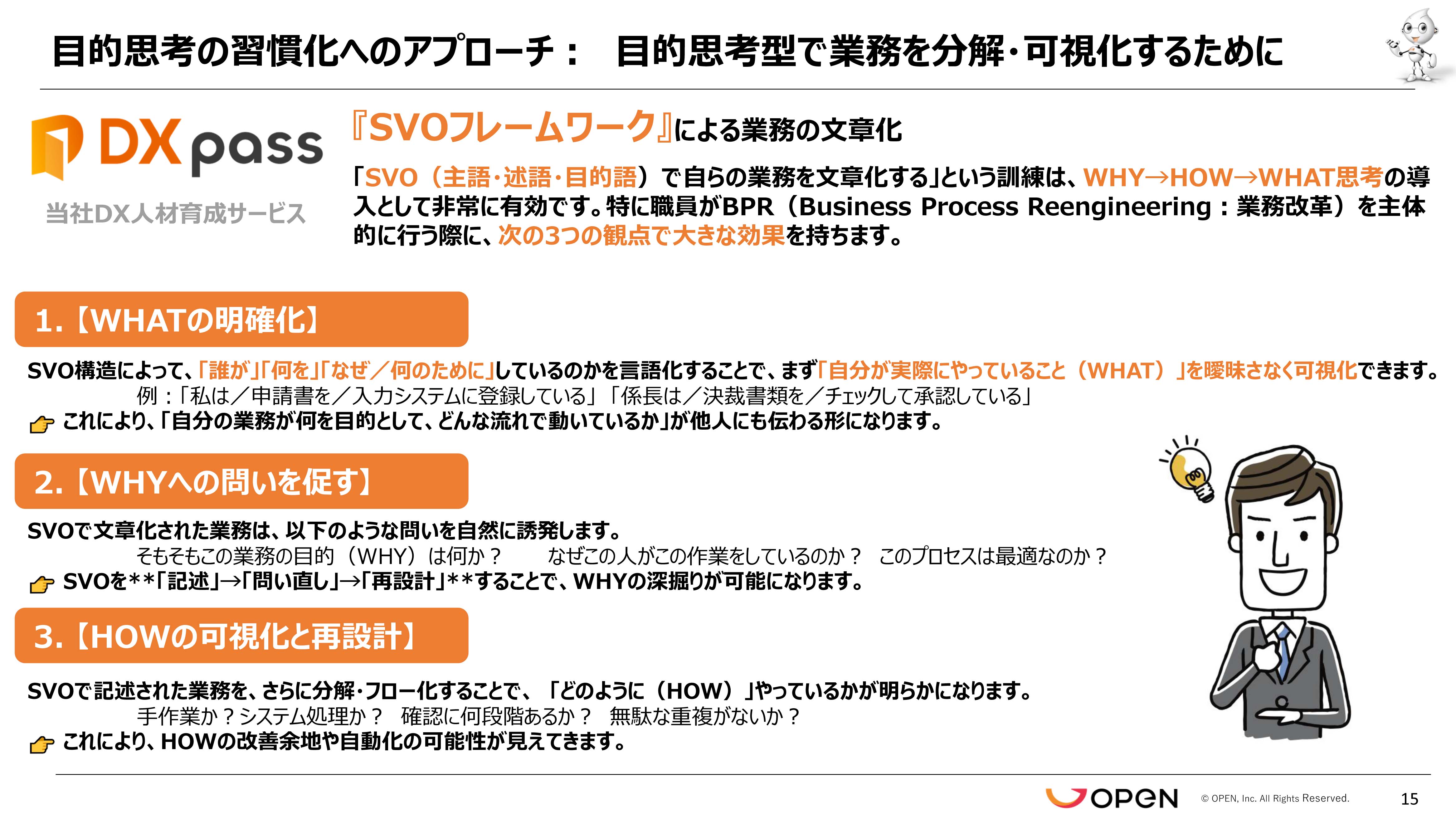 上図で「DXpass」とあるのは当社の人材育成のサービスです。SVOフレームワークという仕組みで“業務の文章化”をしています。この、自分の業務を主語、述語、目的語に分解して文章にするという訓練は、WHY→HOW→WHAT思考の導入として非常に有効。特にBPRなどを進める場面で大きな効果を発揮します。