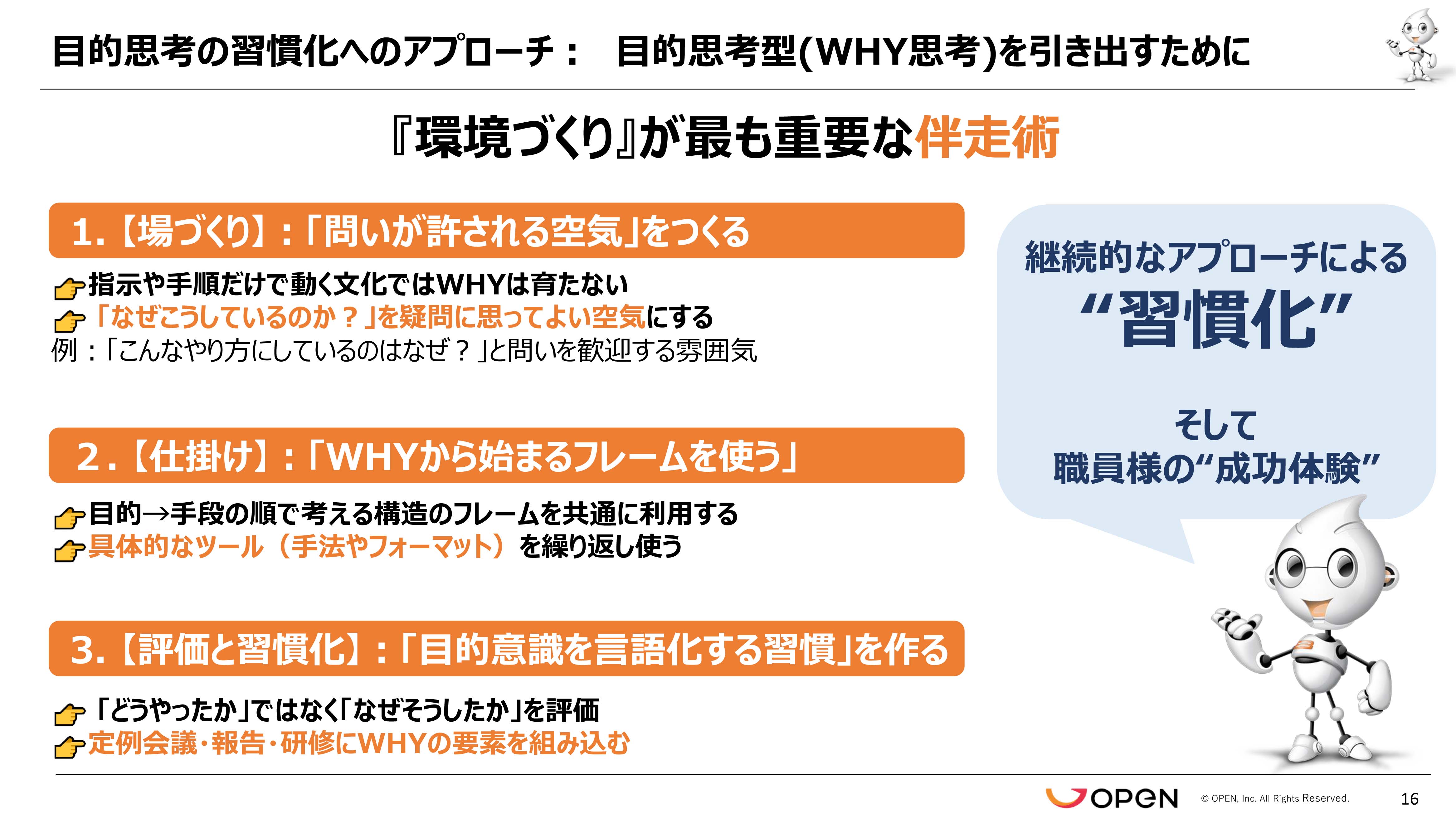 そして、もう1つ大切なのが環境。なぜ、という問いが許される職場であること、それが習慣化できること、そして成功体験を積める場であること。こうした環境が職員の目的思考を生み出していくのです。ポイントとしては、以下に示す3つが挙げられます。