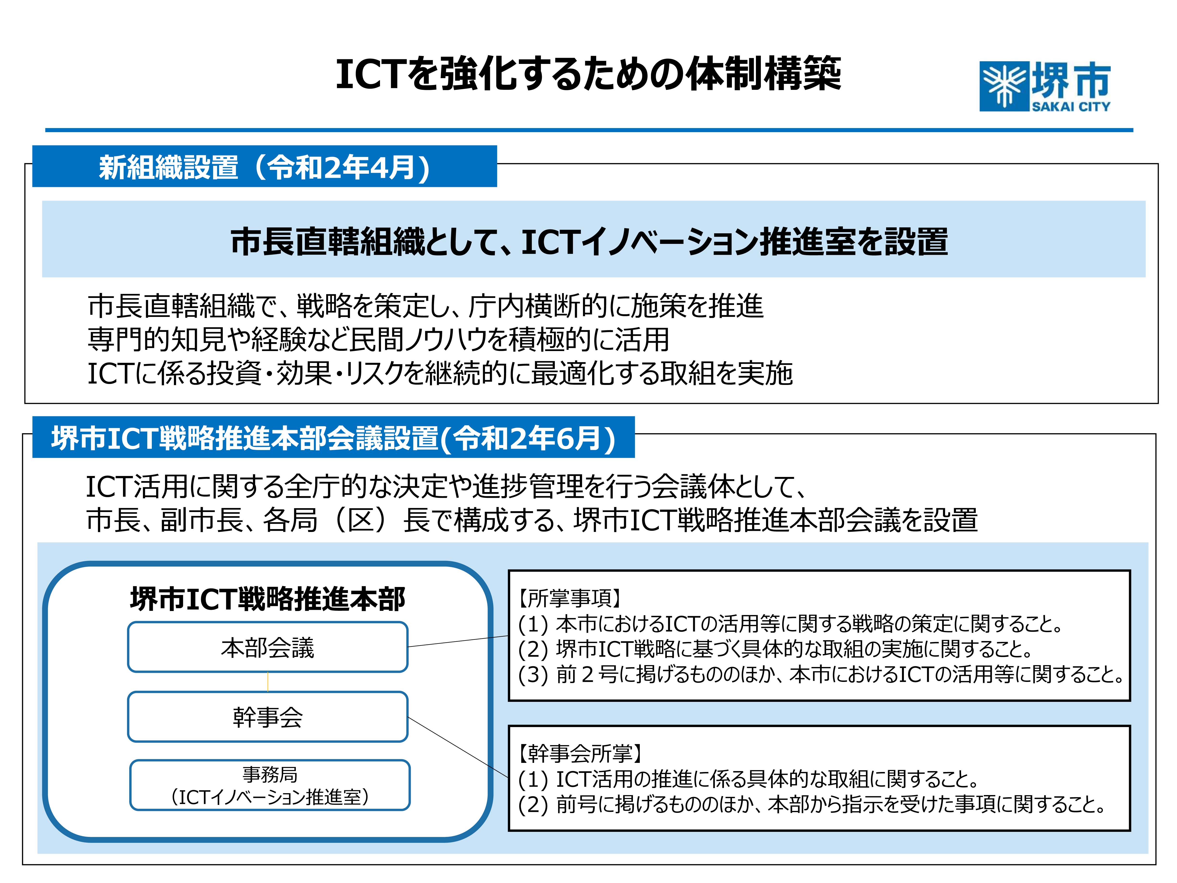私が所属するICTイノベーション推進室(以下、推進室)は、令和2年に市長直轄組織として設置されました。同時に、ICT活用に関する全庁的な決定や進捗管理を行う会議体として、堺市ICT戦略本部会議も設置されています。詳細は上図の通りです。