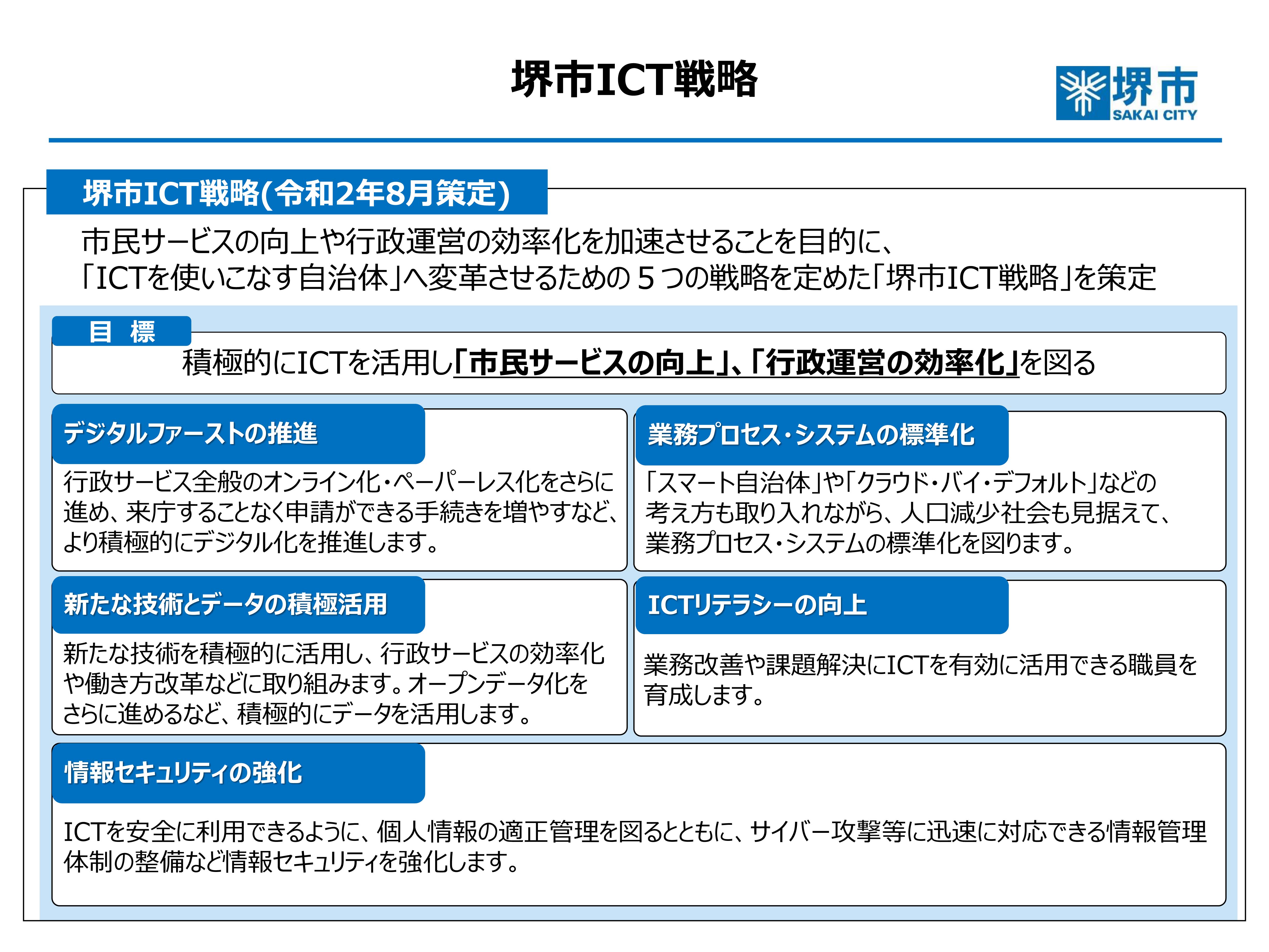 推進室の設置後、令和2年8月に「堺市ICT戦略」を策定しました。積極的にICTを活用し、市民サービスの向上、行政運営の効率化を図ることを全体の目標に掲げ、ICTを使いこなす自治体へ変革させるための戦略を定めています。