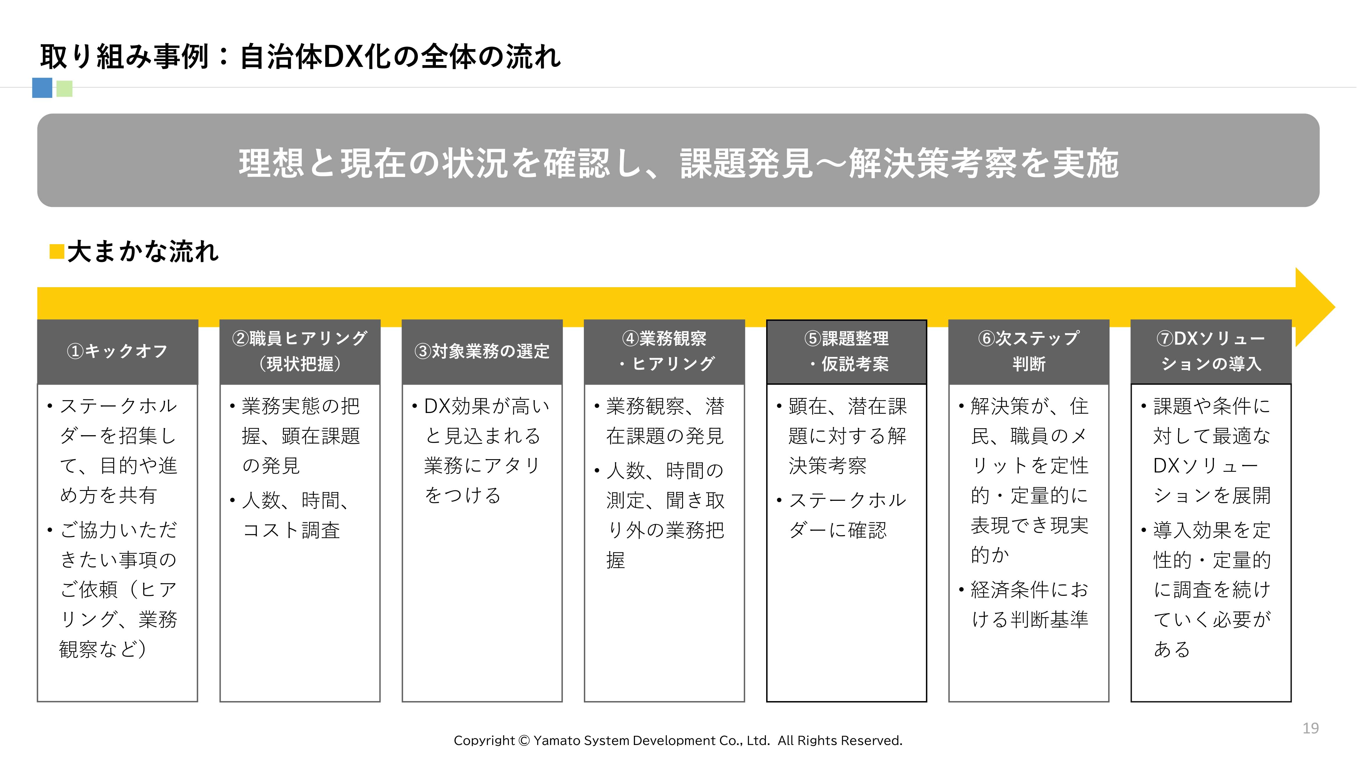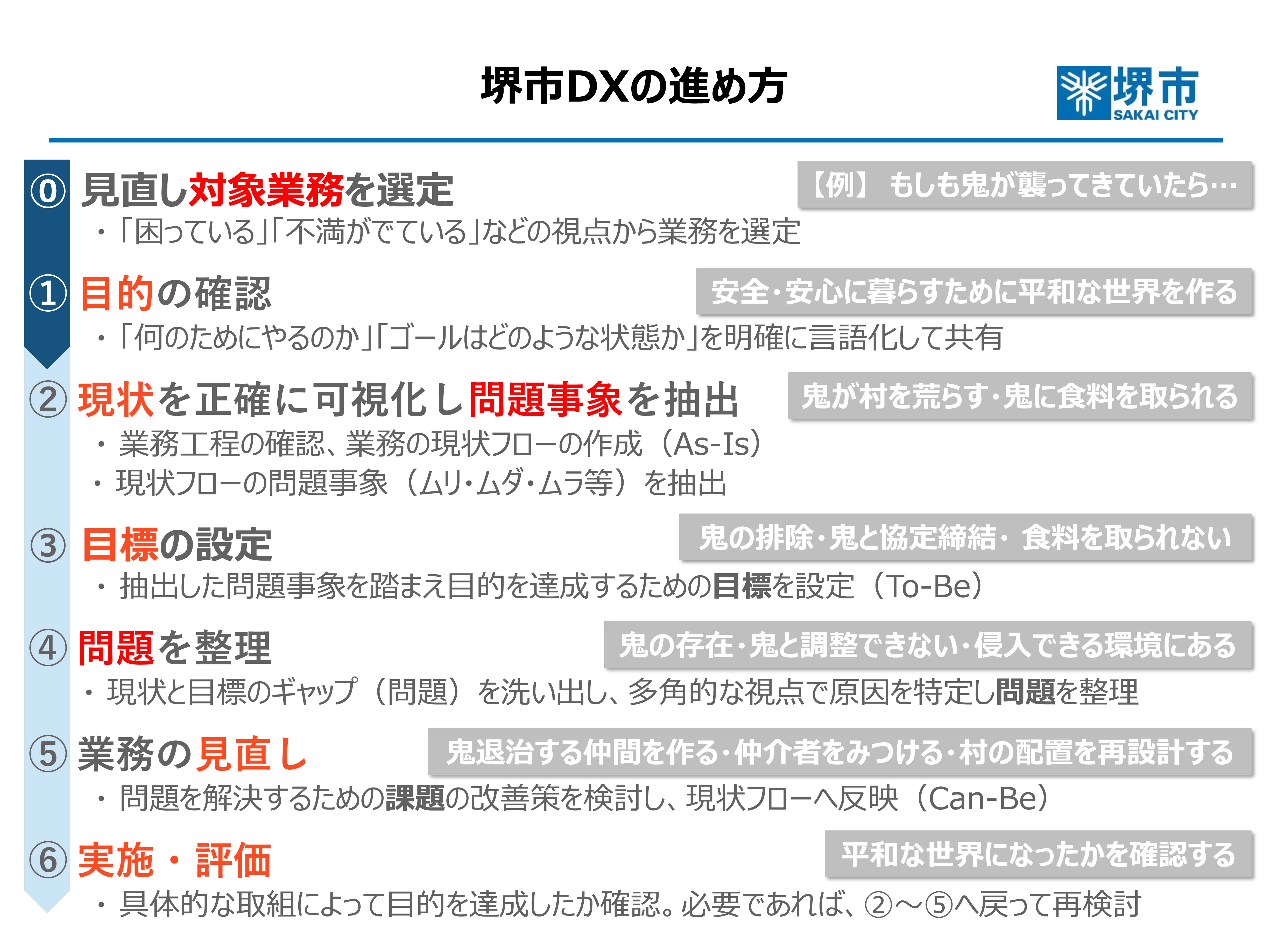 DXに取り組むため、進め方を示したのが上図です。目的の明確化に始まり、問題事象の抽出、それを踏まえた目標設定……と進んでいきます。