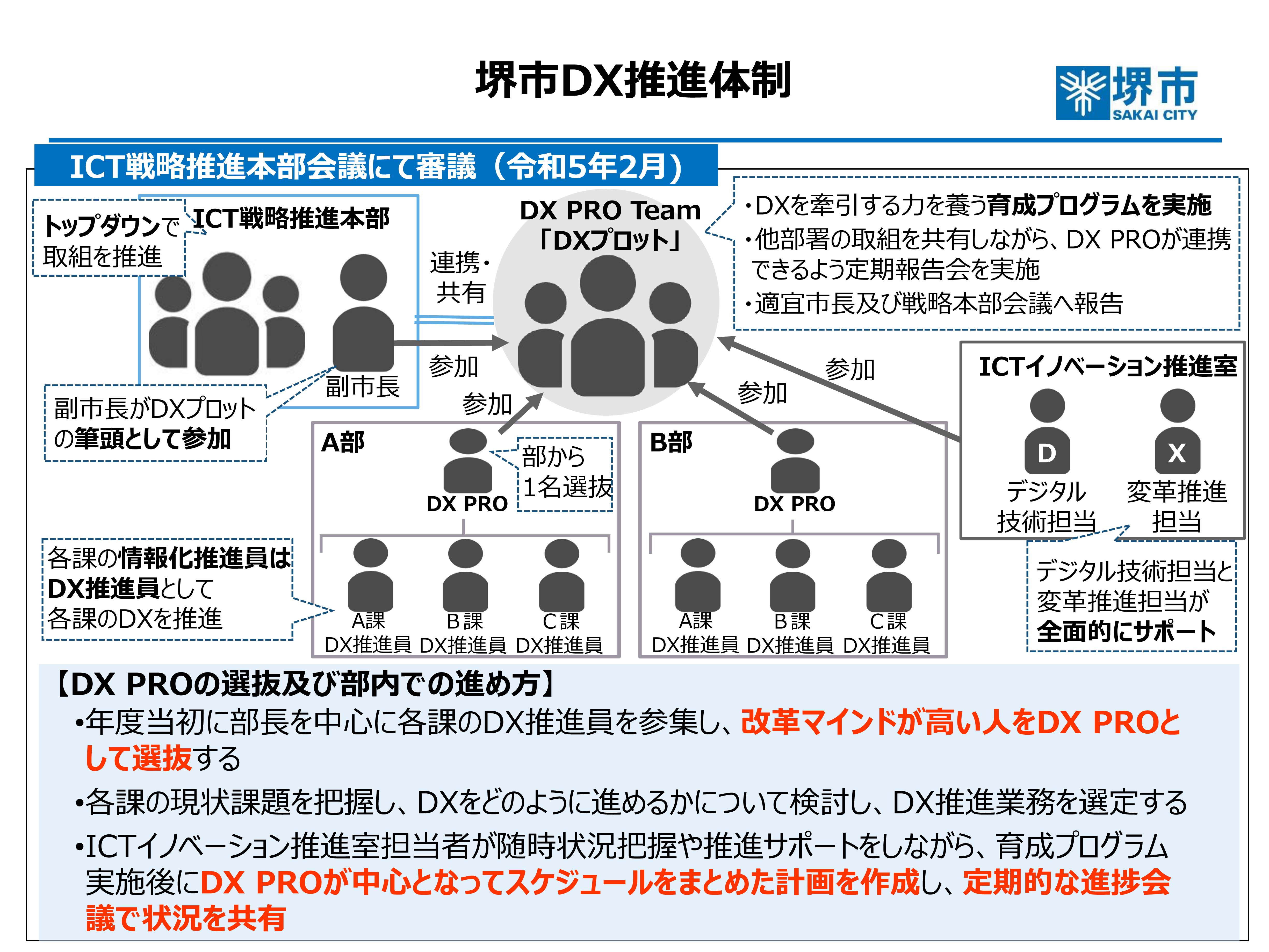 副市長を筆頭にDX PROと推進室でチーム「DX PROT」を結成。DX PROには育成研修を実施し、DX PRO同士が連携できるような情報交換の場を設けています。取り組みについては、市長および戦略本部会議でも共有するという全庁一体の体制です。