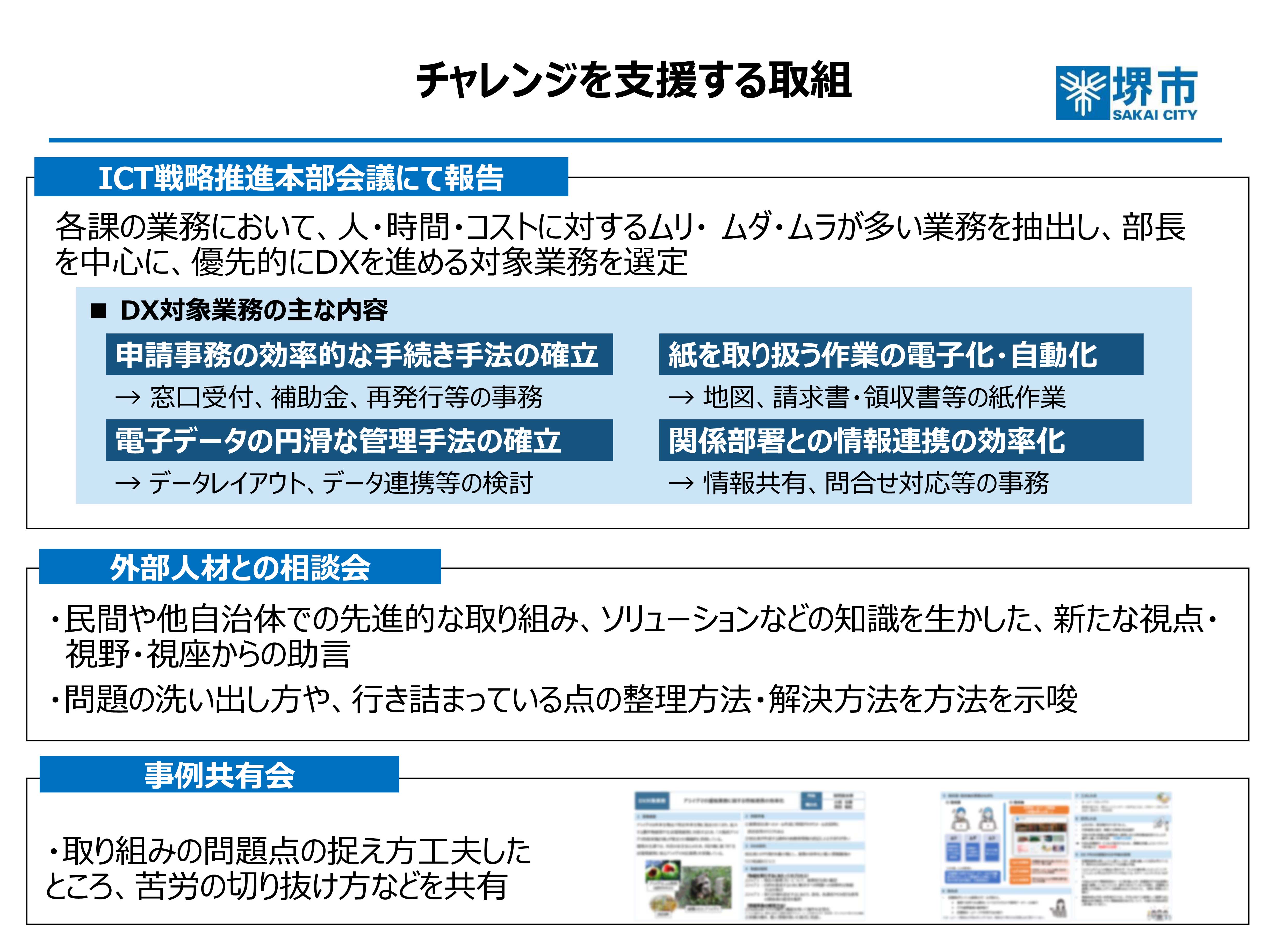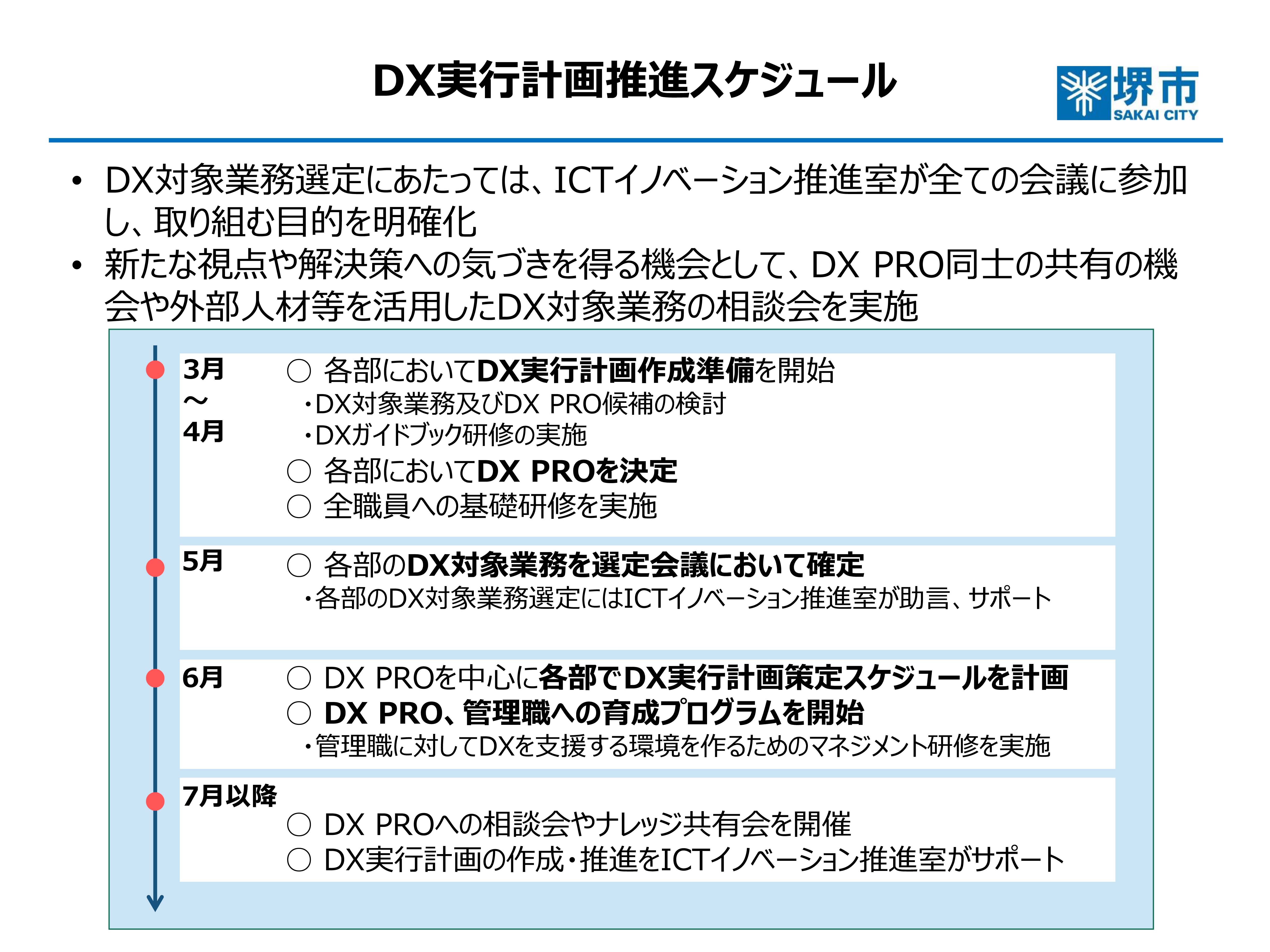 このプロセスの中で選定された業務に対し、DX PROを中心として「DX実行計画」に落とし込みながら、検討を進めていくという流れです。計画については、進捗を確認しつつDX PROが1人で悩みすぎないよう推進室がフォロー。さらに、ICT戦略本部会議を通じて市長や各局長にも共有し、推進を依頼することで、市で一体となって進めるように工夫しつつ、DXデザインアドバイザーによる相談会なども設けながら、様々な立場からのサポートを準備しています。