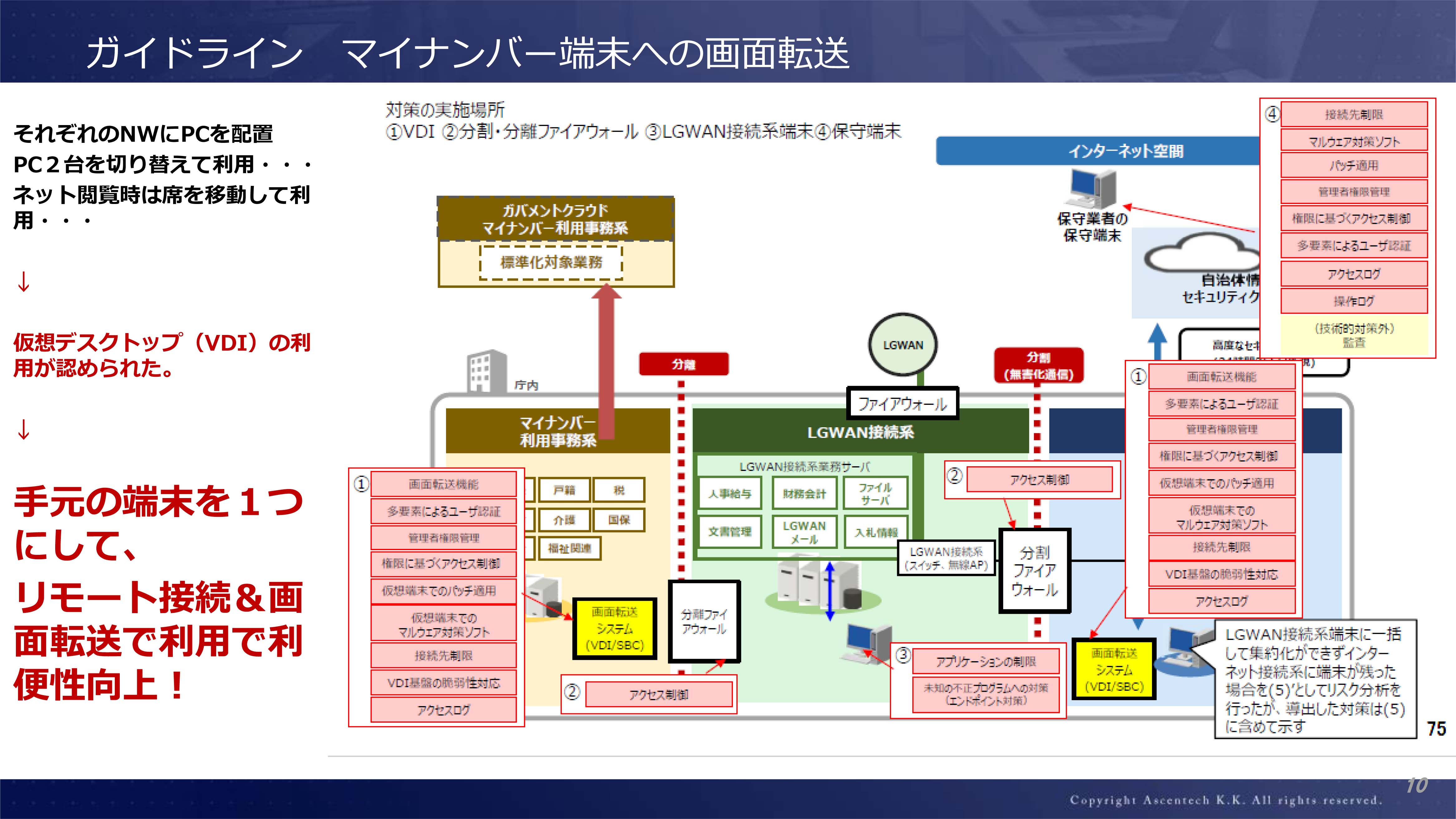 簡単に説明すると、今までマイナンバー系のネットワークは、他のネットワークと分離しないといけない、という書かれ方でしたが、今回の改定を機に、画面転送を利用すれば他の領域と通信をしてもいい、という方針になりました。一部前提条件はありますが、パソコン2台持ちの解消という観点で画面転送の仕組みを検討する自治体が増えています。