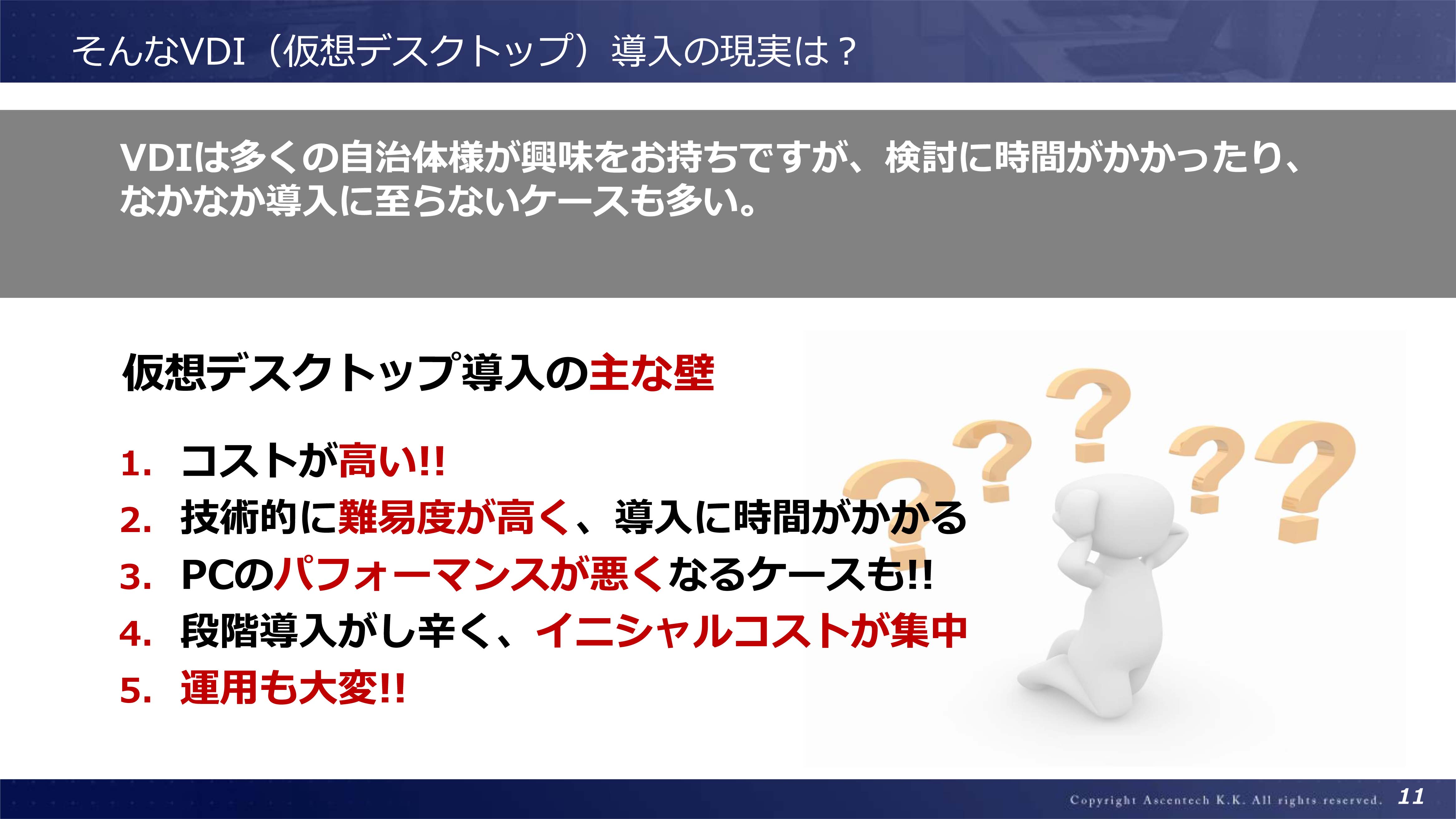 ただ、この仮想デスクトップの仕組みですが、これまでは自治体で検討いただいても導入に至らないケースが多くありました。理由は下記のようなものです。