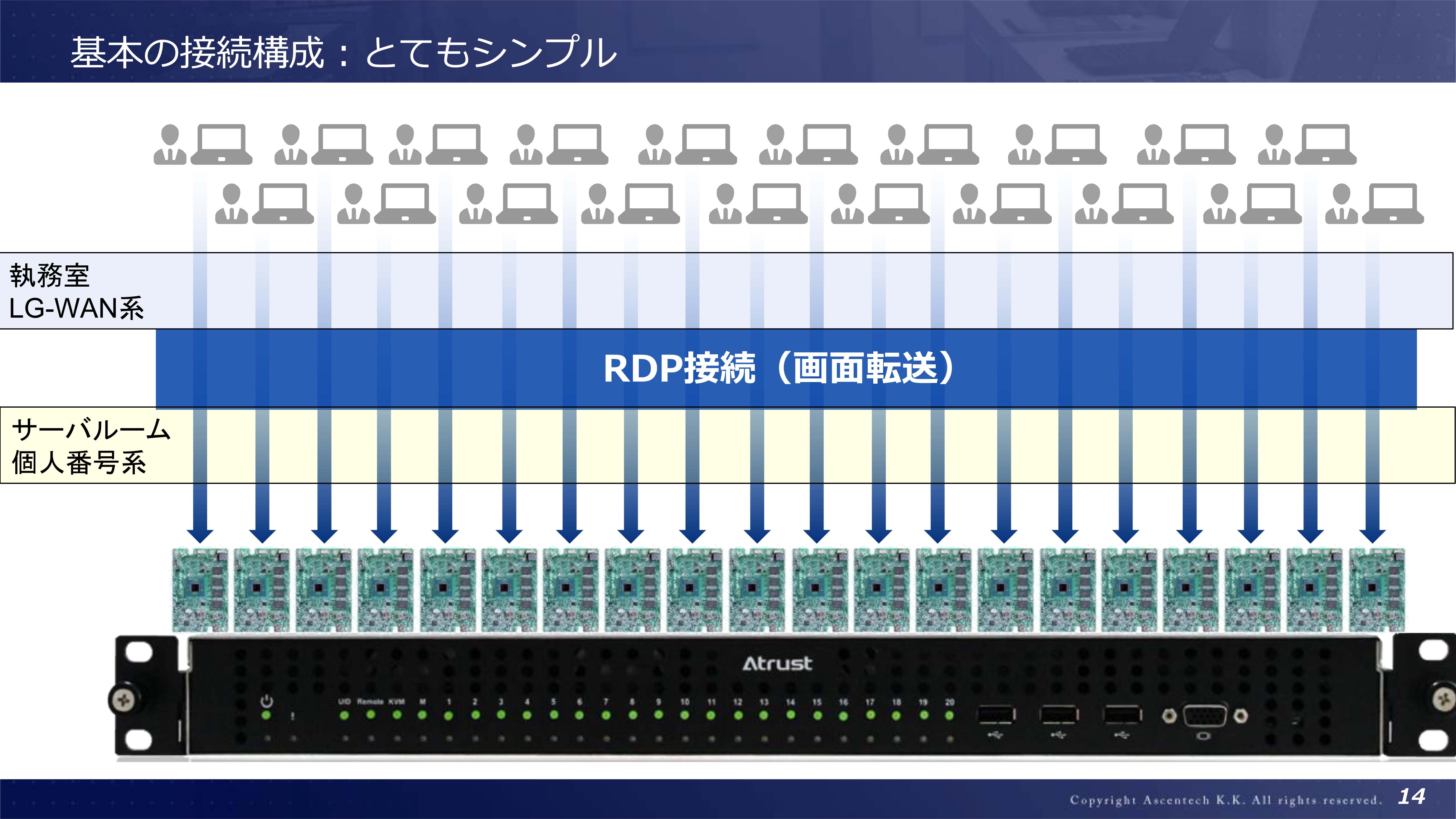 事例としては、宮崎県の西都市がこのリモートPCアレイ100という製品を導入しており、マイナンバー系にある140台分のパソコンを7シャーシに集約。LGWAN系の端末からマイナンバー系に置いたリモートPCアレイにアクセスして、画面転送の仕組みで使われています。これにより管理コストが軽減され、デスクのパソコンも1台になって業務効率が上がり、物理的なセキュリティ面も高まったと評価されています。