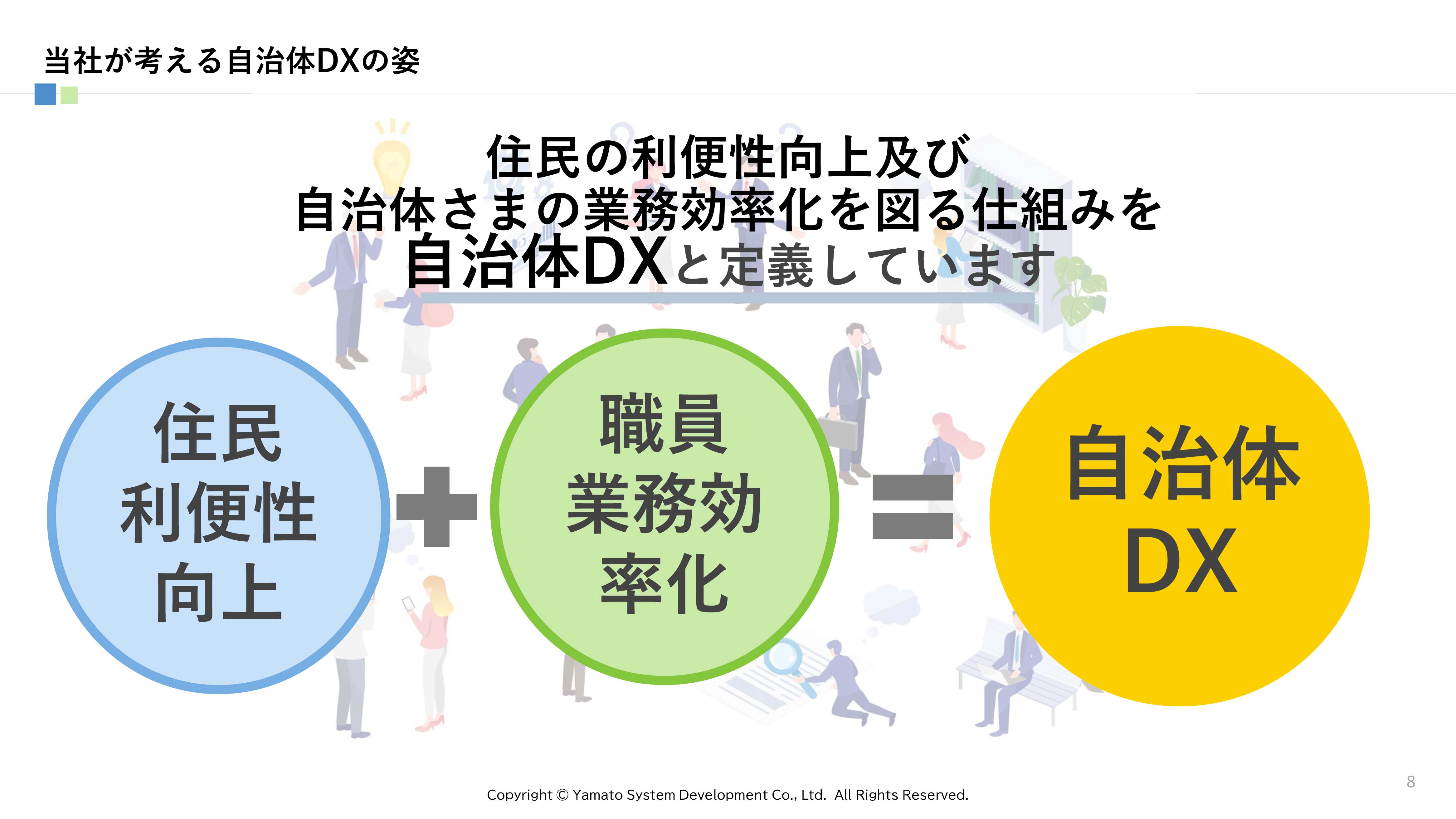 当社が考えている自治体DXの姿は、住民の利便性向上と、職員の業務効率化。この両方を図った仕組みを自治体DXとして定義しています。