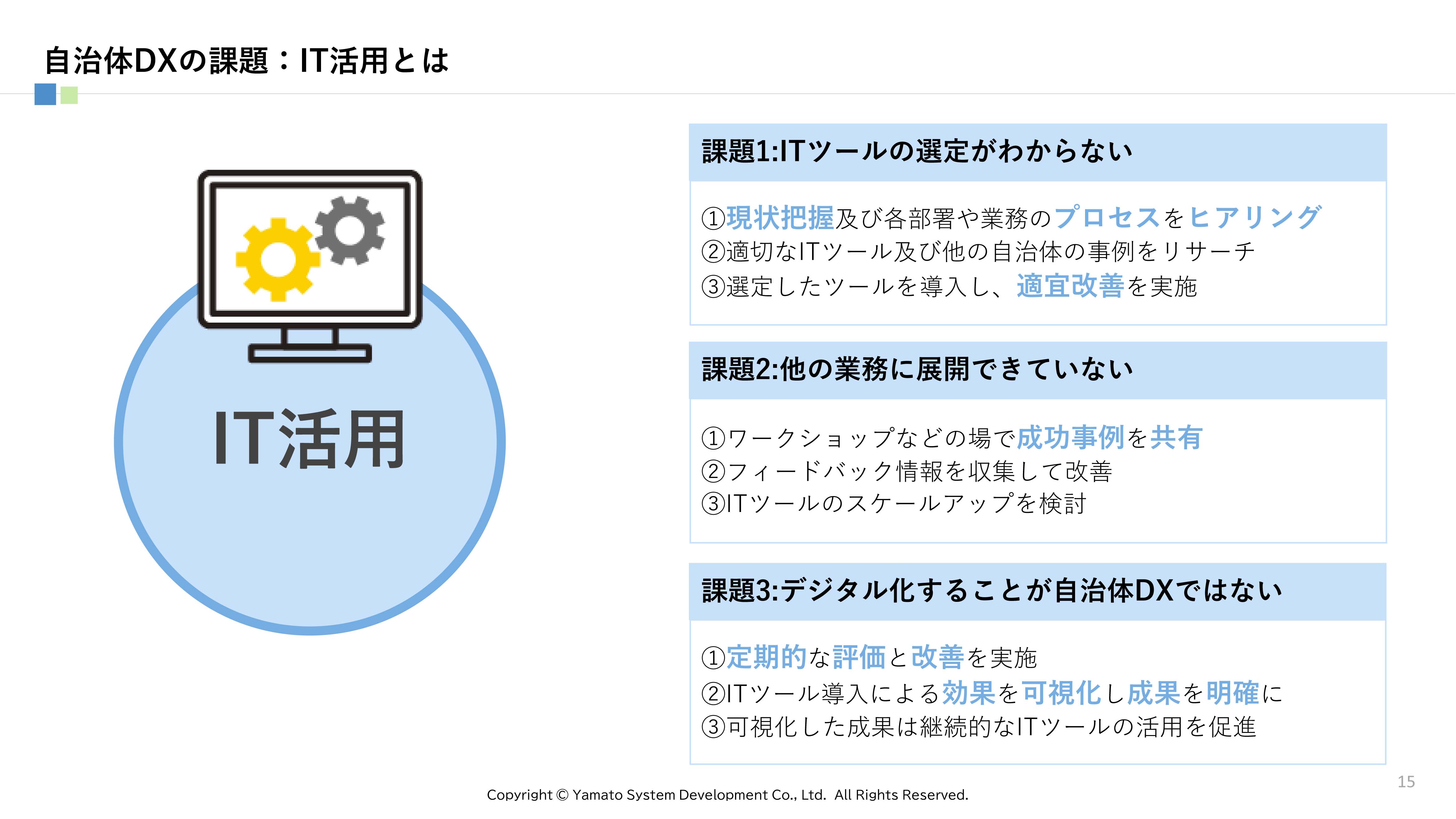 次にIT活用のスキルについて。どういったものが自分の自治体で必要なのかを把握する必要があります。まずは現状を把握し、業務のプロセスで何が課題なのかをヒアリングした上で、適切なITツールを他自治体の事例も見ながら考えていかなければなりません。また、庁内で成功した事例が生まれても、それが横展開できていないとアンバランスな状態になります。成功事例は積極的に共有し、フィードバック情報を収集して、さらにより良いものを活用していくことが必要です。そしてデジタル化をした後は、定期的な評価と改善を行い、結果を可視化しながら継続的にITツールを活用していけば、より良い結果につなげていくことができます。