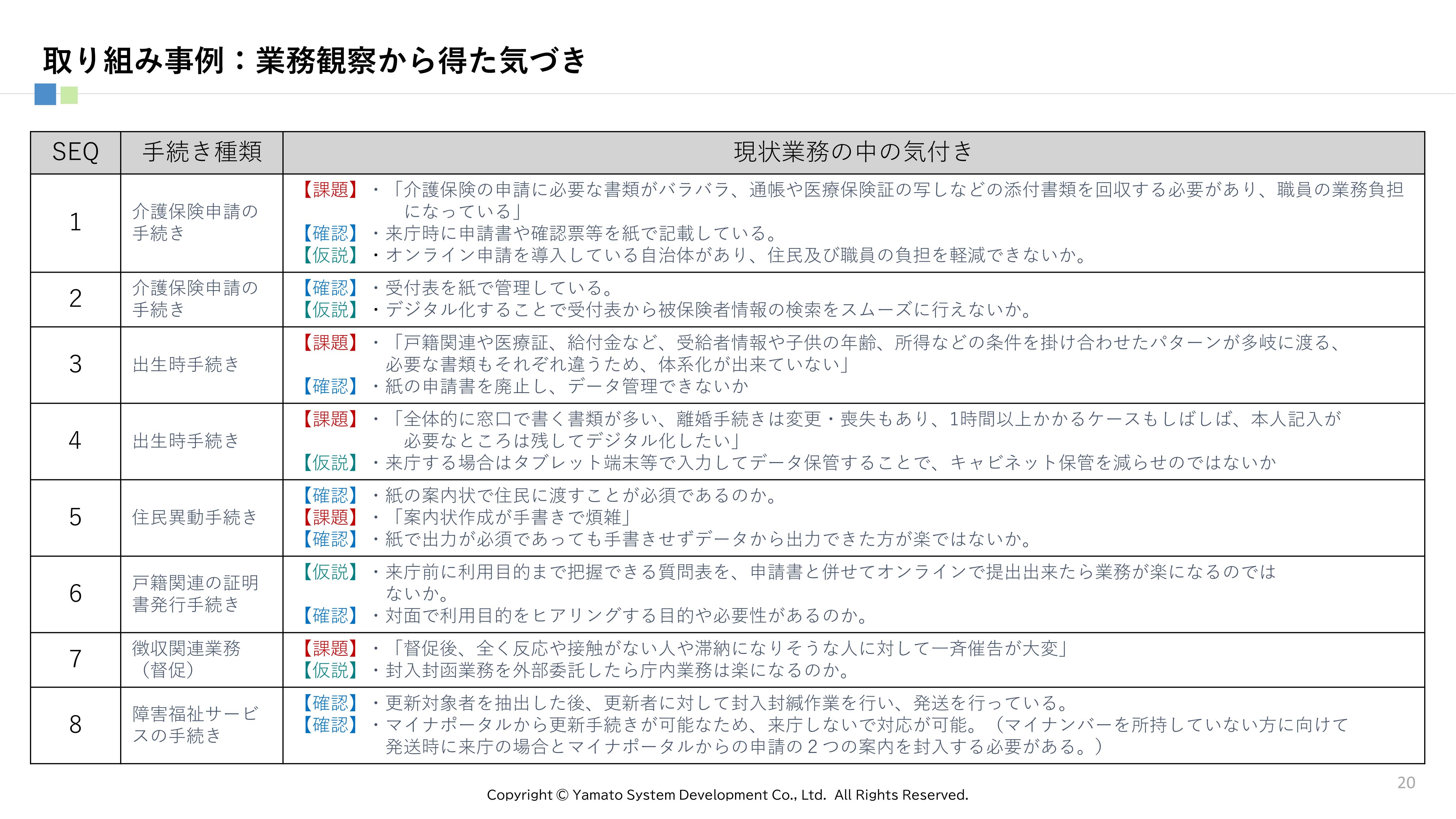 この内容をベースに解決への仮説を立て、検証をした上で、業務量が大きく効果も大きいものを洗い出し、手続きや受付の業務を改善するために「手続きワンスオンリーサービス」というものを提案しました。