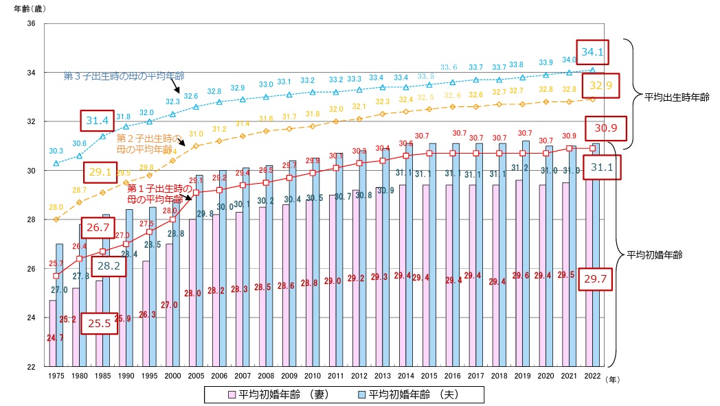 厚生労働省の統計によれば、令和6年の平均初婚年齢は妻は約30歳・夫は約31歳であり、平成12年の妻27歳・夫29歳から上昇を続けている。平均初婚年齢はこの20年あまりで男女ともに約3歳上昇しており、晩婚化が進むことで第1子の出産年齢も上昇し、少子化の進行を加速させている。