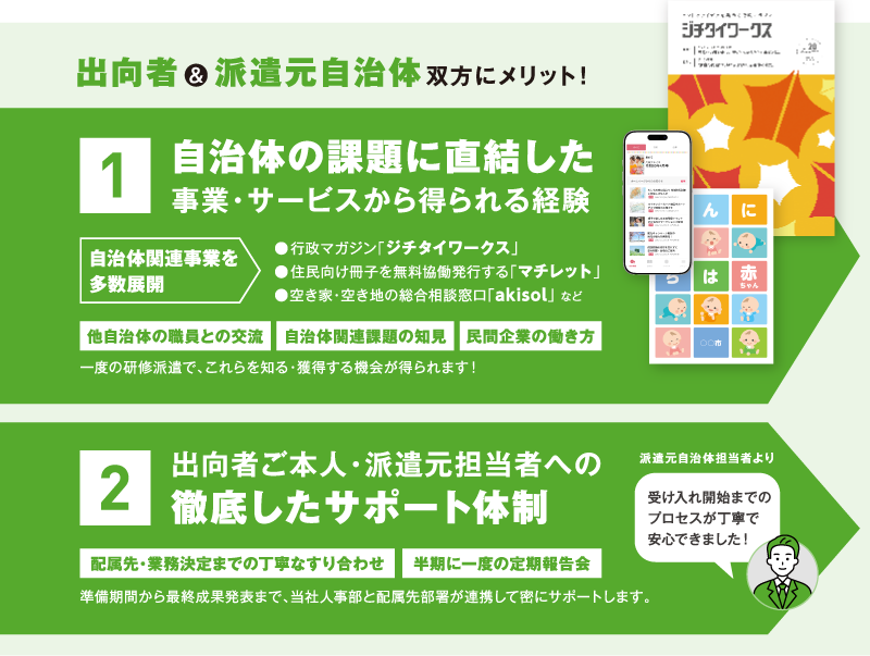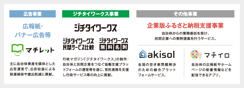 自治体職員向けメディア「ジチタイワークス」をはじめ、広告事業、ふるさと納税支援、空き家対策、情報配信など