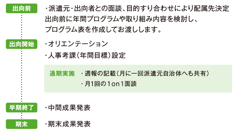 2023年度から研修派遣の受け入れを開始し、2025年度で3年目を迎えています。今までに東京都世田谷区、福岡県 小郡市、鹿児島県出水市、長崎県長崎市から、計5名の出向者を受け入れております。