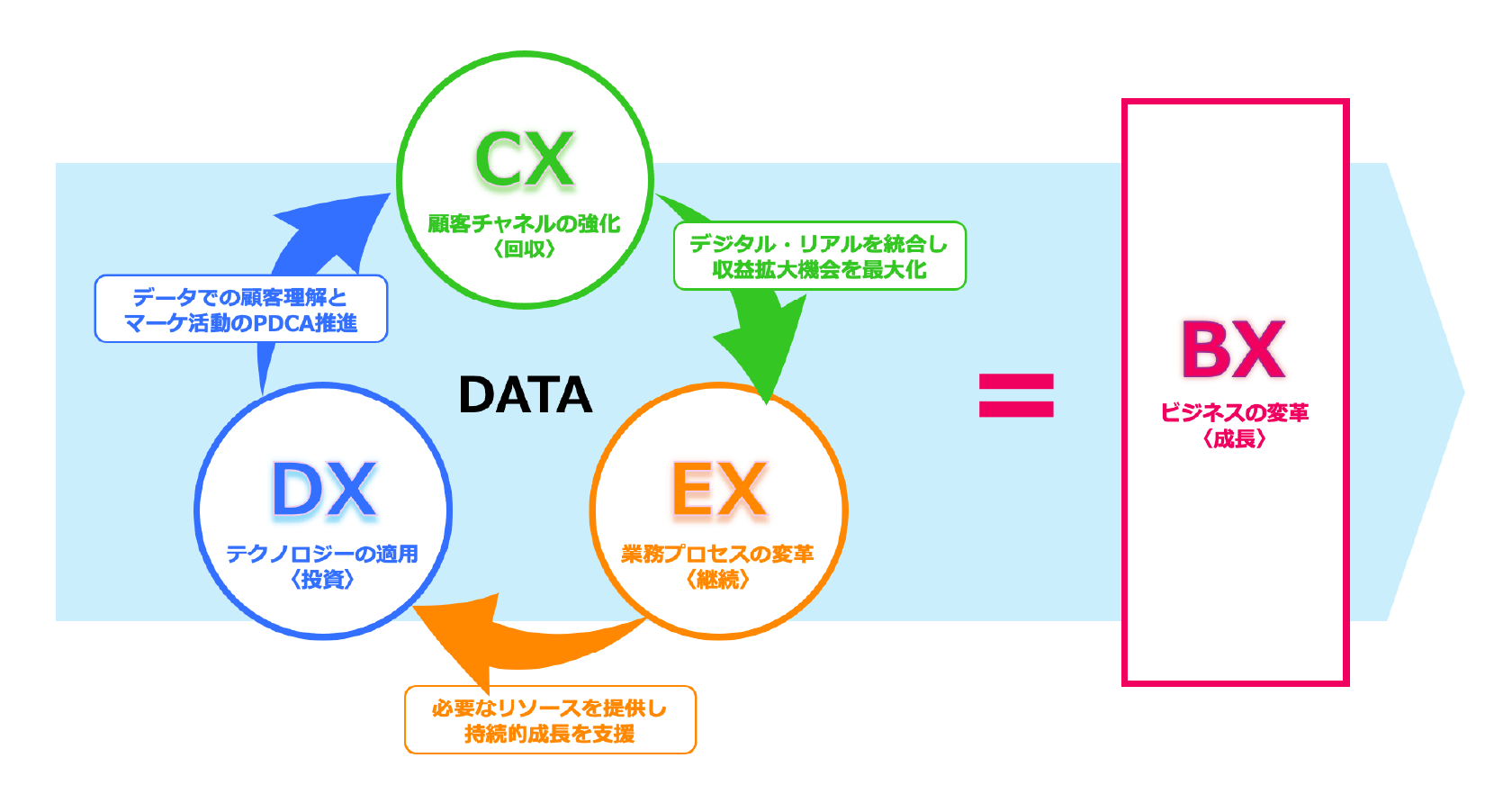 変革の基盤となるDX投資のための開発支援を起点に、その投資を成果に変え、収益機会を拡大するためのCXを強化。さらに、事業運用に必要なリソースを提供して持続的成長を支援するEXによって、ビジネスの変革を実現する。
