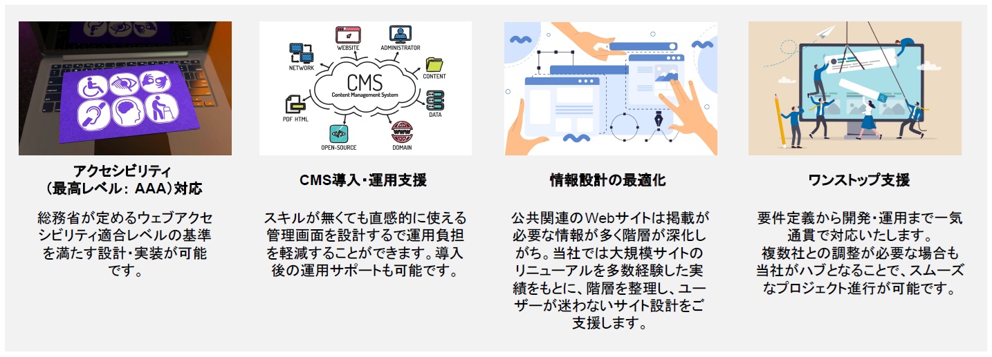 アクセシビリティ基準(最高レベル:AAA)の対応はもちろん、CMSの導入から運用支援までWEBサイト・ホームページの制作/リニューアルをワンストップでサポートいたします。 現状把握・課題抽出を丁寧に行うことにより、官公庁・自治体・公的機関などの関連団体様固有の課題を、 リニューアル面・運用面の双方で改善・解決していきます。