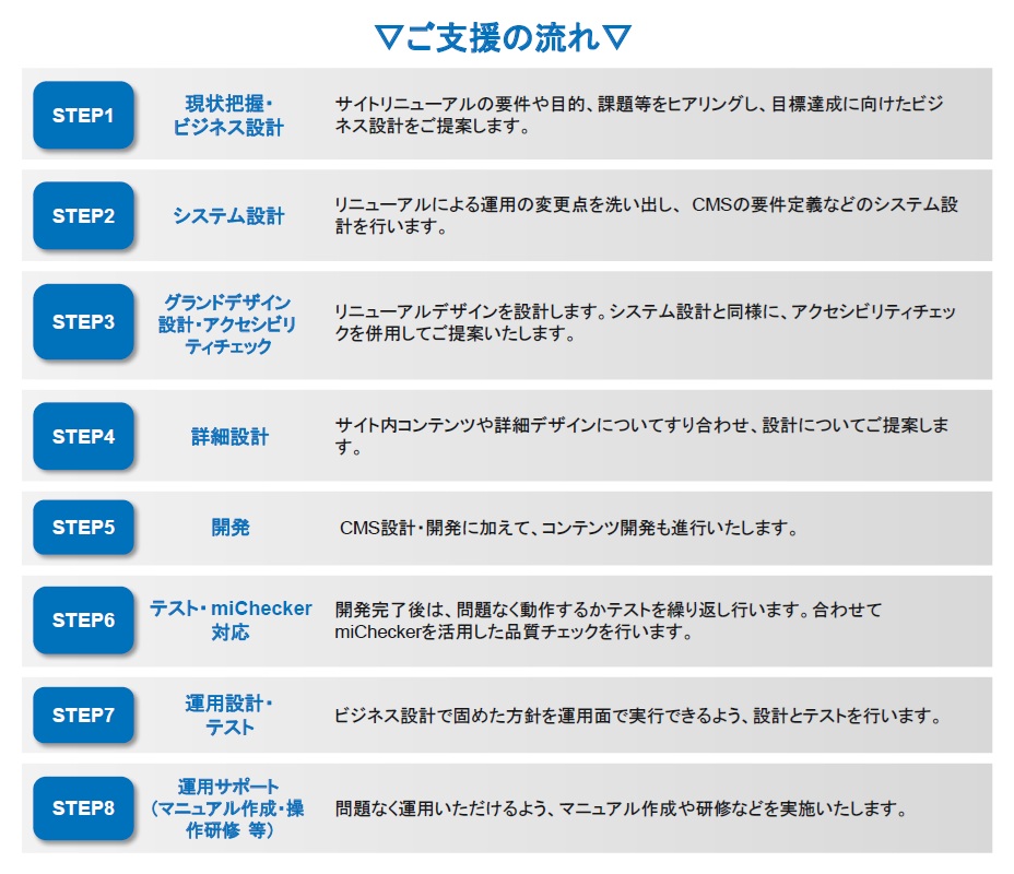 官庁・地方自治体・公共機関向けサイトリニューアルサービスは以下のような流れでご支援いたします。