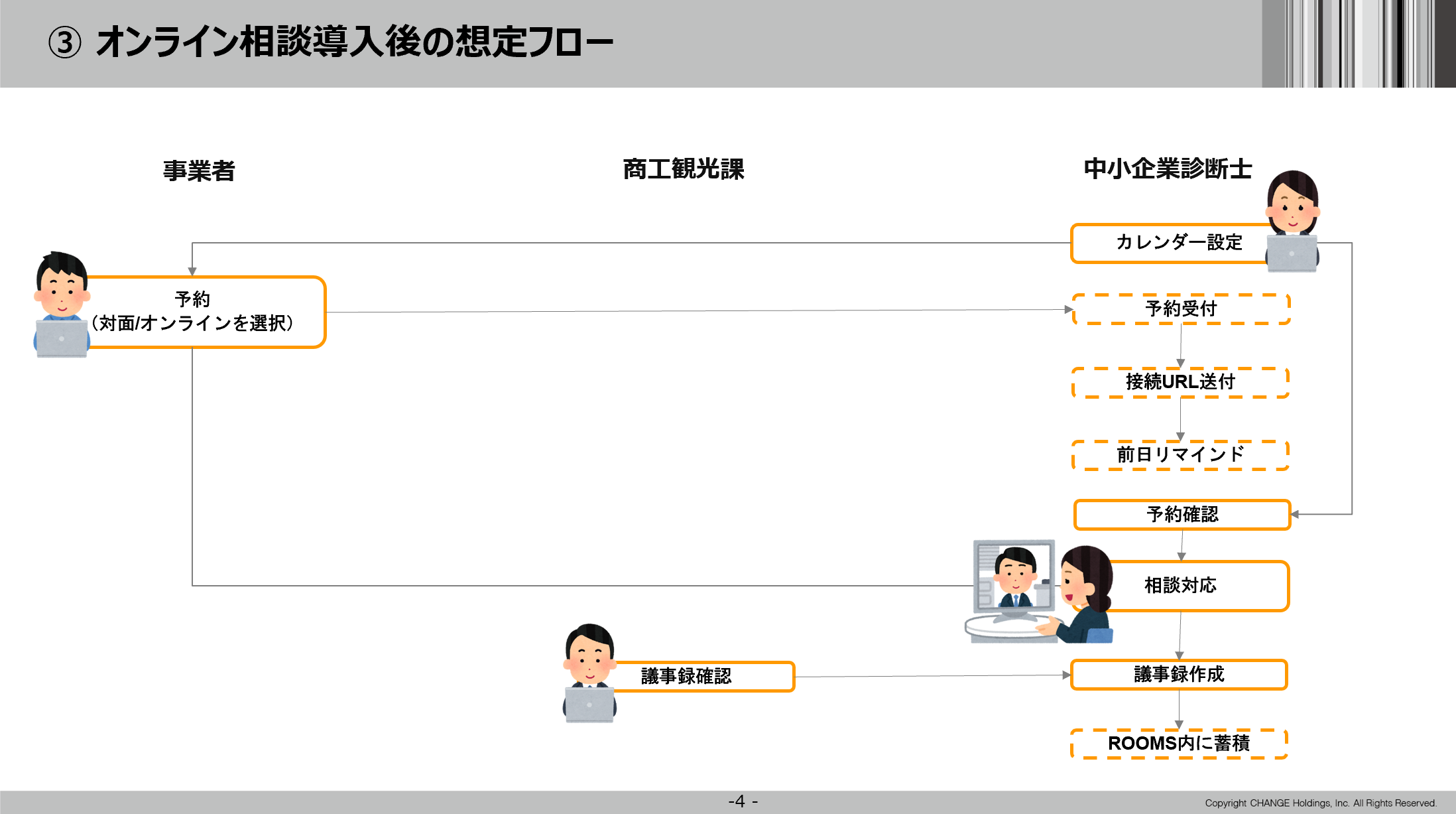 そこで、オンライン化に踏み切りました。正式に稼働するのは10月に入ってからですが、オンライン相談導入後に想定されるフローは以下の通りです。