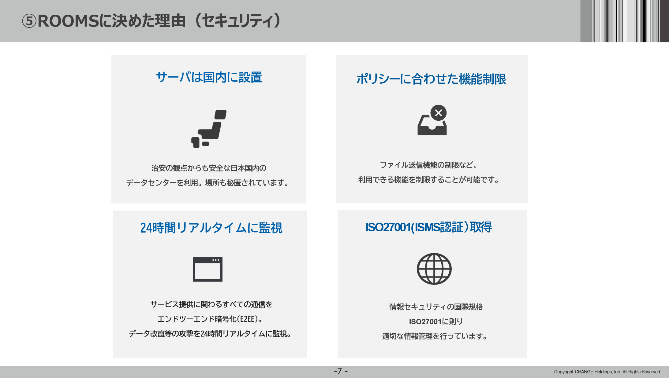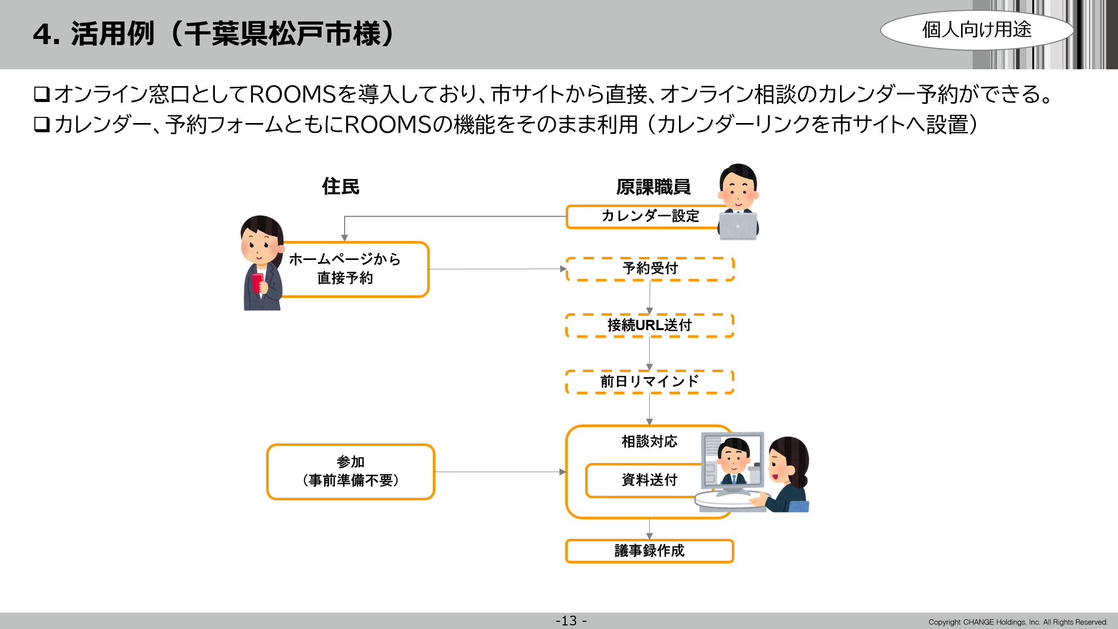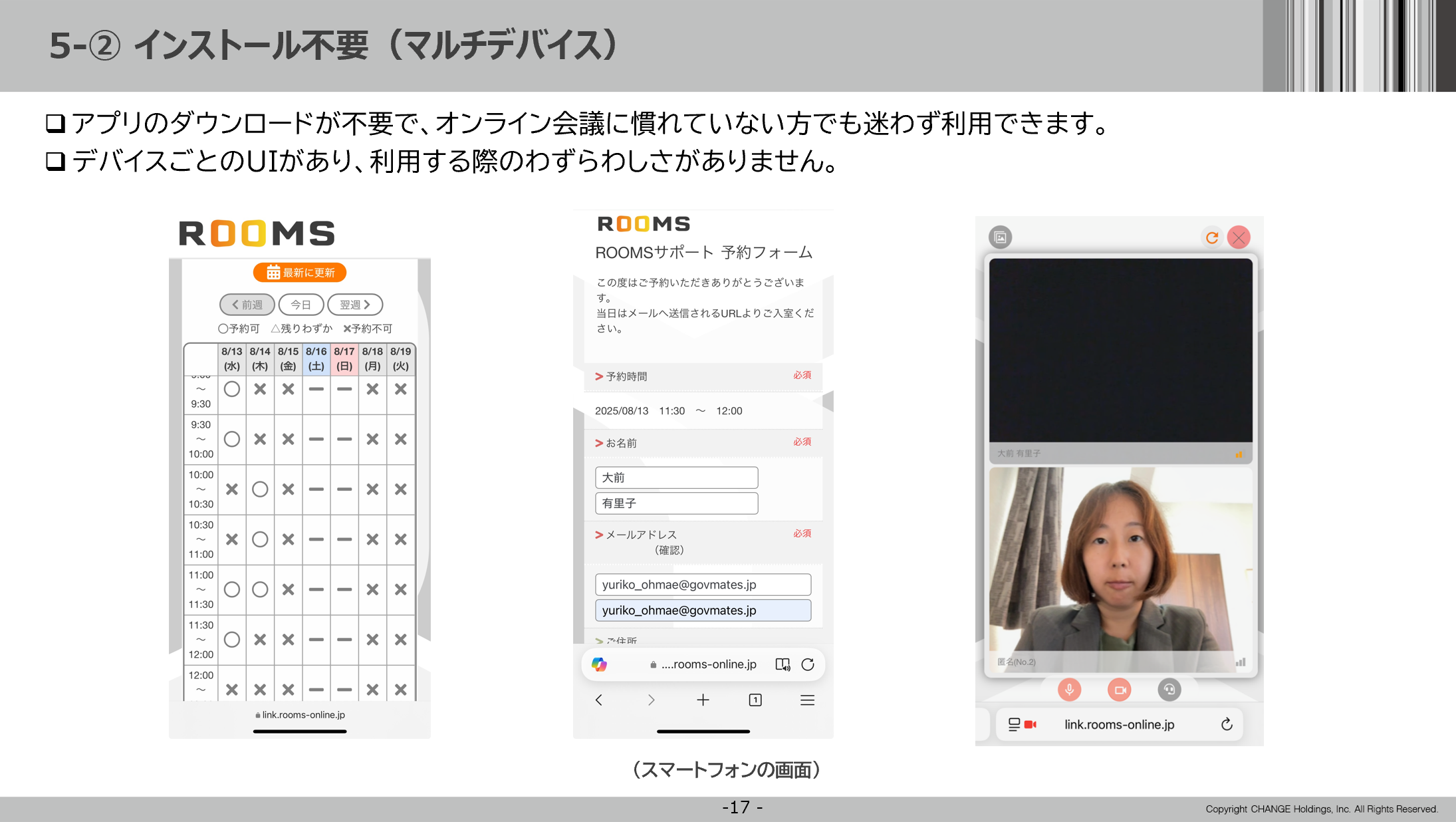 第2部は株式会社チェンジホールディングスの大前有里子氏が登壇。オンライン相談システム「ROOMS」の概要や導入事例などを伺った。