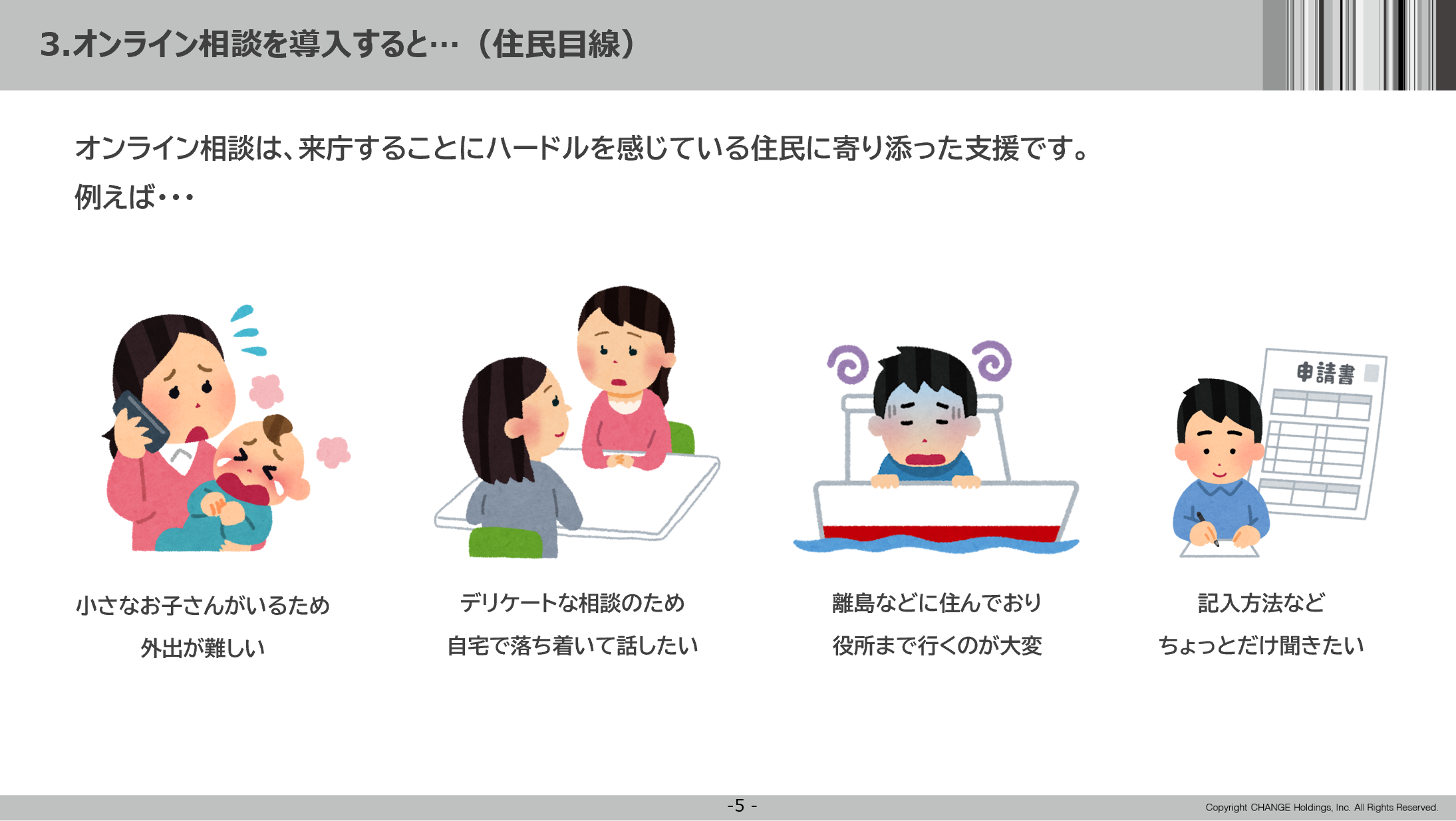 住民目線で考えると、小さな子どもがいて外出が難しい場合や離島に住んでいて役所まで行きにくいといった場合には、オンライン相談は利用しやすいでしょう。また、まわりの目が気になってデリケートな相談ができないといった場合にも、自宅なら落ち着いて話すことができます。このほか「わざわざ来庁するほどではないけれど、書類の一部分だけ確認したい」というニーズにも寄り添えます。