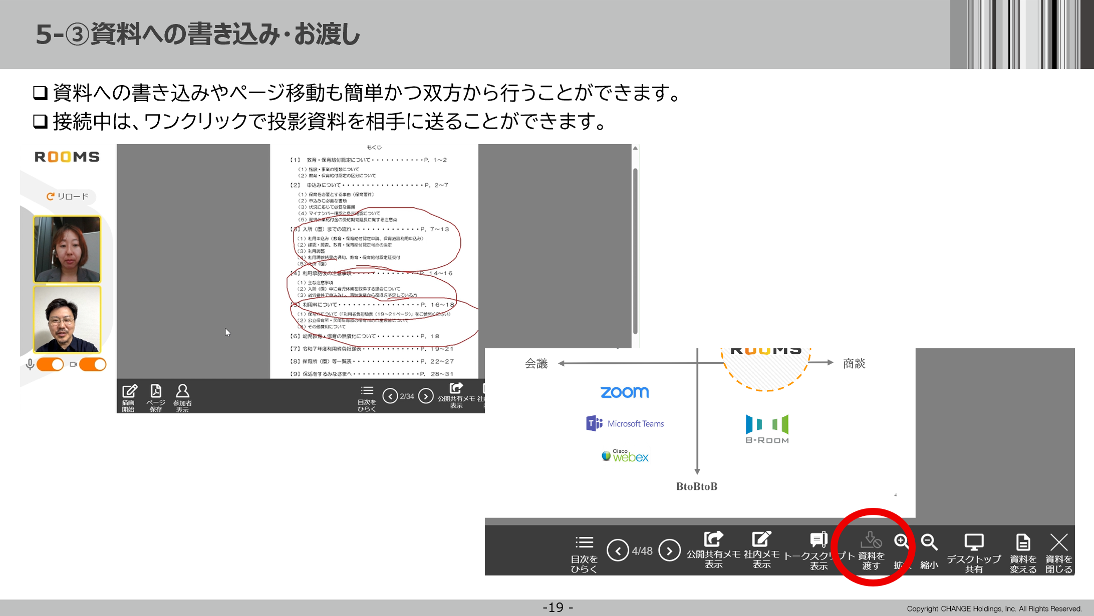「ROOMS」を使えば、オンライン上の資料に直接書き込めます。職員側でページをめくったりメモを書き込んだりすることはもちろん、住民からも同様のアクションが可能なため、対面に近い感覚で会話ができます。さらに、「資料を渡す」をクリックすると、投影中の資料を住民にダウンロードしてもらうことも可能です。