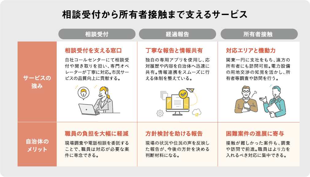 委託にあたっては、各区の意見をまとめるため、定期会議や説明会を実施。業務時間の削減と市民サービス平準化の目的や、メリットなどを説明した。その結果、令和6年度は相談件数の多い上位5区にて相談受付を、また一部の案件を対象に所有者訪問を試験的に委託したという。入札により委託先として決定した「東電用地」について、内山さんは「コールセンターの報告書が非常に丁寧で、受け付けた相談内容が一目で把握できます。相談者へ親身に寄り添っている様子も伝わってきました」と評価する。こうした細やかな報告は、自治体側の判断や今後の方針を考える上で大いに役立っているそうだ。また、所有者訪問の委託も初めての試みだったが、期待以上の成果が出ており「職員では接触できなかった困難な案件も粘り強く働きかけてくれたおかげで、複数の案件で進展が見られました」。遠方に住んでいる人や、昼間の接触が困難な対象者にも、柔軟に接触できる同社の体制に魅力を感じたという。