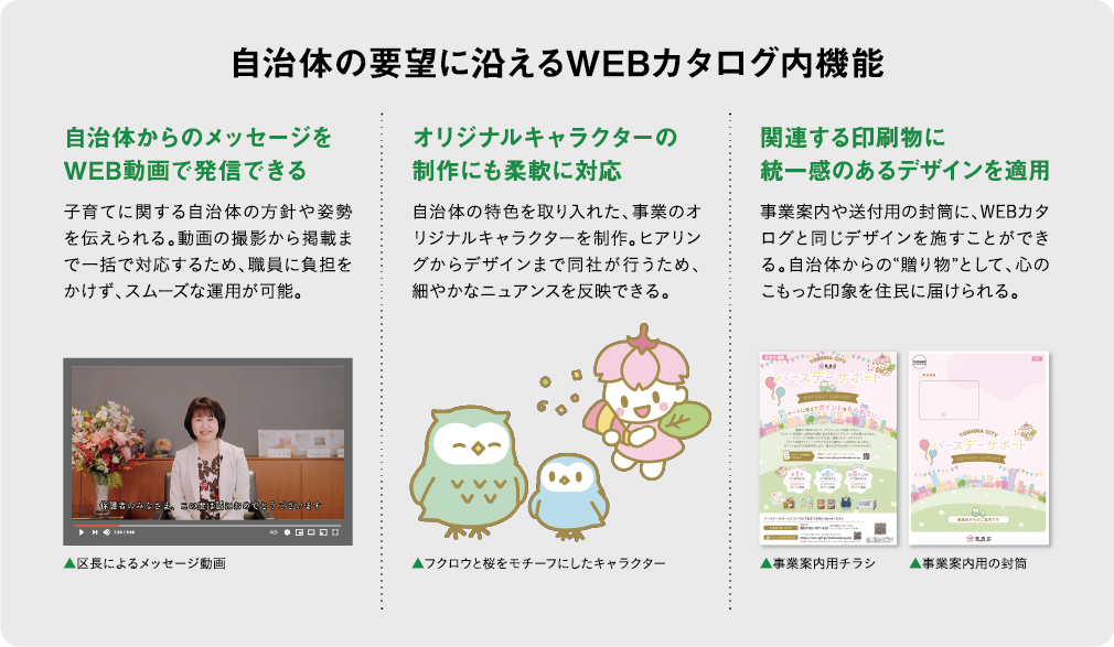 WEBカタログには育児用品や家電製品、家事代行サービスなど1,000点以上の商品を掲載。複数のメーカーと連携し、幅広い商品を取り揃えているという。またカタログサイトの制作にあたっては、同区の意向に沿ったデザインを実装。その一環として、区にゆかりのあるフクロウや桜をモチーフにしたオリジナルキャラクターを制作。事業案内や封筒にも使用されている。「関連する印刷物に統一感があることで、“贈り物”として温かみを感じられる仕上がりになっています」。