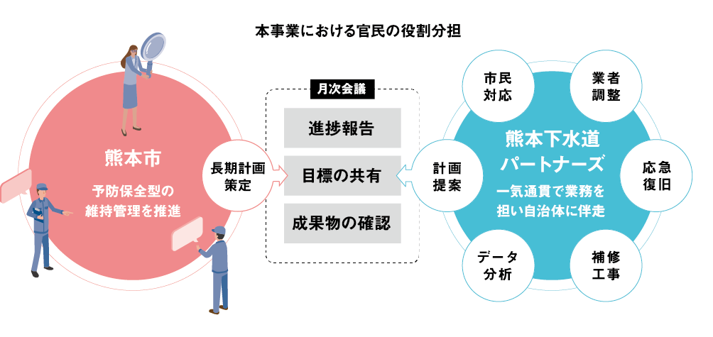 その中核を担ったのが「インフロニア・ホールディングス」の傘下である「前田建設」だ。地元企業を含む4社※1と「熊本下水道パートナーズ」を結成し、下水道の新たな維持管理体制の構築を進めている。「市民対応から業者の調整、作業まで一気通貫で行ってくれています。当事業は中央区限定の取り組みですが、複数社が知恵と技術を補完し合うことで、業務委託にとどまらないインフラ運営の実現が近づいていると思います」と太田さんは話してくれた。