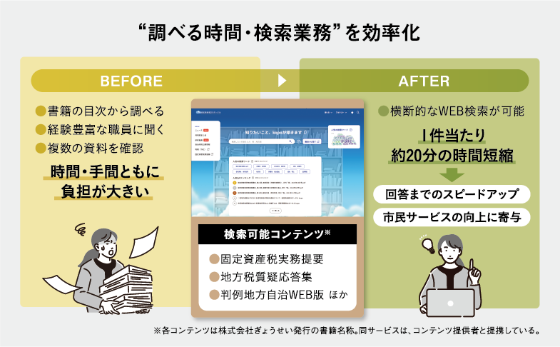 固定資産税業務には、資料探しに多くの時間がかかるという課題があった。「適正・公平な課税のために、過去の事例や判例を確認し、根拠となる資料を揃える必要があります。これまでは、税の専門誌や実務提要などの書籍の目次から見当を付けて、一冊ずつ調べていく作業に、膨大な時間を費やしていたのです。また、求めている資料がなかなか見つからないことも少なくありませんでした」と和田さんは話す。