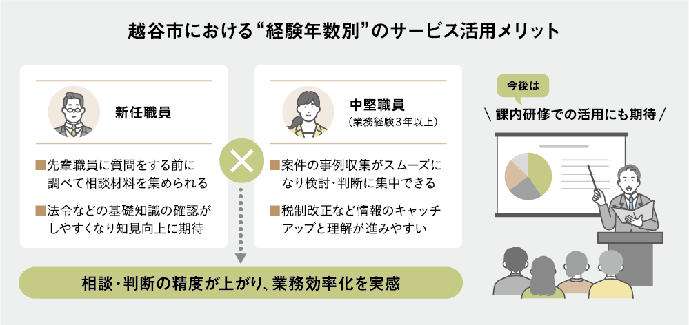 こうした効果を踏まえて、今年度から本格導入を開始した。「より複雑な案件を担当する中堅以上の職員がよく利用している印象です。検索候補がいくつも表示されるため、自分だけではたどり着けなかった事例や知識を得られています」。経験が浅い職員にとっても、基礎知識の確認や、ほかの職員に相談する前の下調べを行うなど、業務で利用できるシーンは多いと評価している。