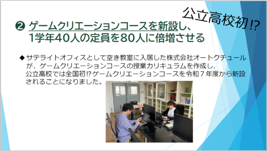オートクチュール社の協力を得て、ゲームクリエイターを養成するための授業カリキュラムも作成。令和7年度から公立高校では珍しいゲームクリエーションコースの新設も決め、それに合わせて定員も80人に倍増させた。現在、サテライトオフィスに在駐する現役クリエイターが授業の補助や部活動の支援も行っているという。
