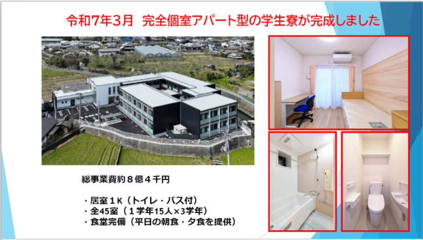 「新設した学生寮には食堂とコミュニティホールも完備しました。寮生以外の生徒や地域住民も利用できる交流の場になっています。砥部分校を存続させるためのプロジェクトに多くの企業が共感し、寄附を寄せてくださいました。本当に感謝しています。寄附いただいた企業の中でも、企業版ふるさと納税の寄附金贈呈式には、「アイグラン」の橋本社長にもお越しいただきました」。