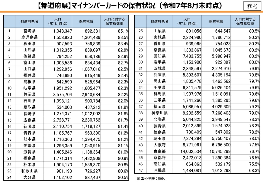 マイナンバーカードの都道府県別の保有状況を見ると、全国平均79.4%を上まわる地域が多く存在する。令和7年8月時点で最も高いのは宮崎県(85.1%)、次いで鹿児島県(83.5%)、秋田県(83.4%)であり、いずれも全国上位の水準となっている。一方、下位県では70%台にとどまっており、住民への周知不足や窓口体制の課題などが背景にあるとみられる。