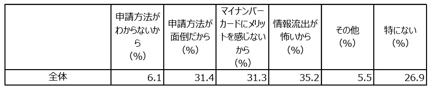 デジタル庁が令和4年度に実施した調査によると、マイナンバーカードを取得していない理由の上位は「情報流出が怖いから」(35.2%)、「申請方法が面倒だから」(31.4%)、「メリットを感じないから」(31.3%)だった。この結果から、セキュリティへの不安・申請手続きの煩雑さ・利便性の認知不足が、普及を妨げる主な要因とわかる。