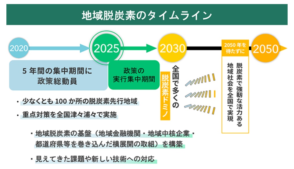 これを受け、国と地方が連携して脱炭素を進めるため、令和3年に「地域脱炭素ロードマップ」を策定。令和7年度までを「集中期間」とし、意欲ある地域から取り組みを広げる“脱炭素ドミノ”の実現を目指している。