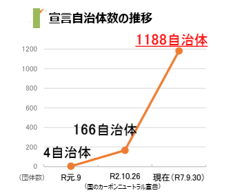環境省のまとめによると、令和7年9月30日時点で、ゼロカーボンシティを表明した自治体は全国で1,188(46都道府県、660市、22特別区、399町、61村)に達した。これは全国の地方公共団体(1,765団体)の約67%に当たり、都道府県の多くで表明が進んでいる。