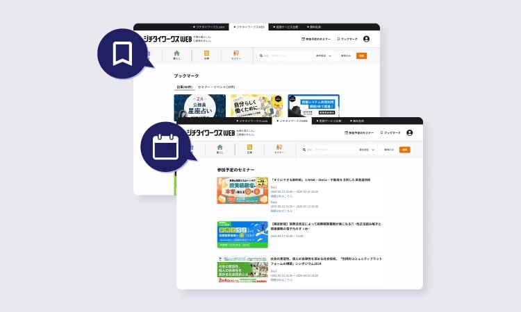 気になる記事やセミナーをしおりマークで保存し、あとからまとめてチェックできます。 「あとで読みたい」を逃さず、情報整理がスムーズに。