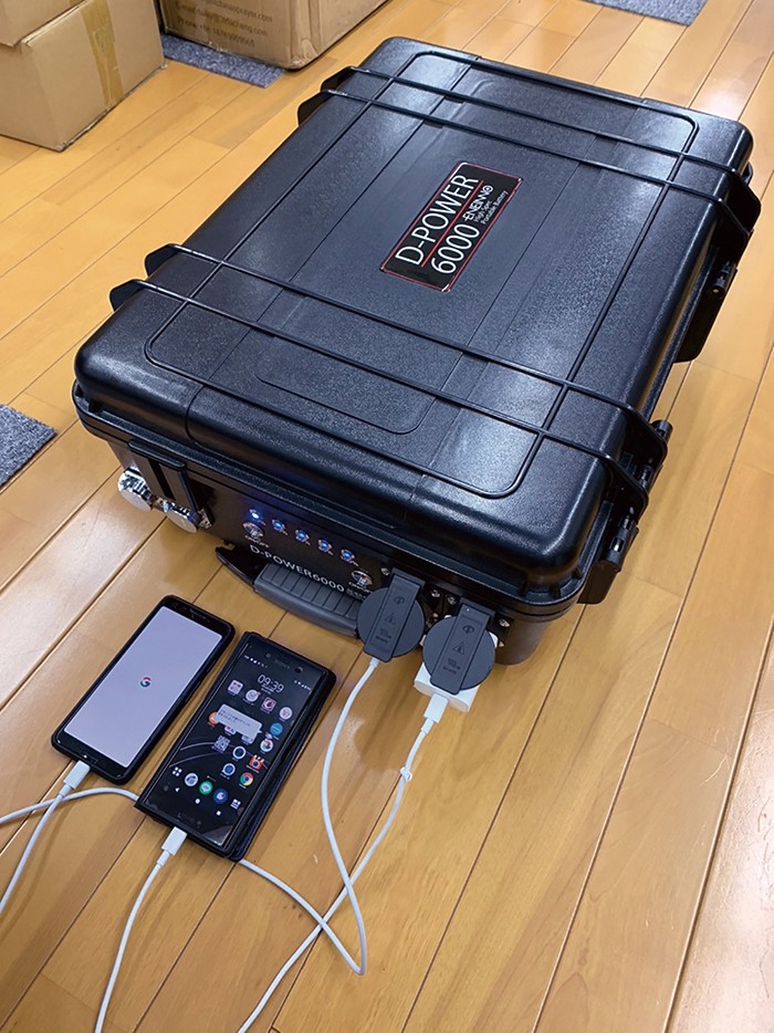 容量6,000Whのリチウムイオンバッテリーを内蔵した大容量蓄電池。スマホ(10W)なら600台分のフル充電が可能。大容量でありながら、簡単に持ち運びできるのも特徴の1つ。