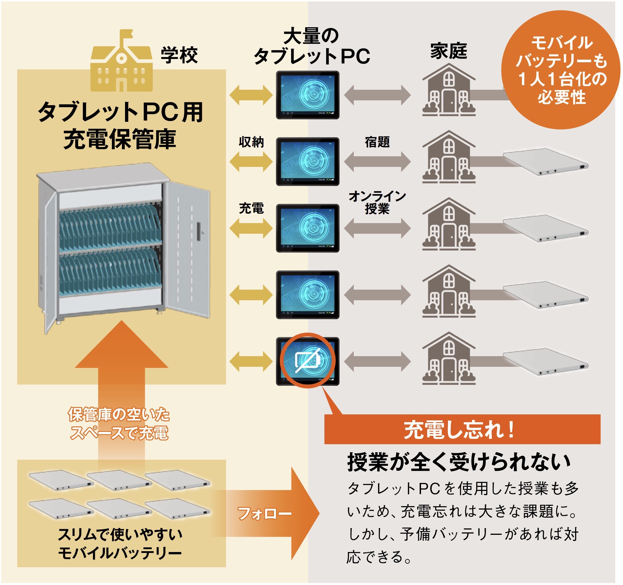 支給された端末は、今や学校だけでなく、自宅での利用(宿題やオンライン授業)が当たり前になっている。「そこで浮かび上がってきたのが、充電忘れの問題です」と市倉さん。自宅での充電を指導している学校も多いが、それでも一定数の充電忘れが発生しているそうだ。