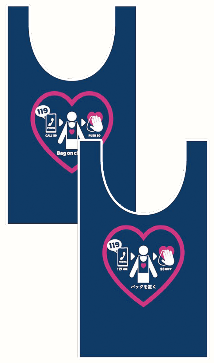 救命サポートエコバッグには、応急手当の手順のイラストが描かれており、心肺蘇生をする際には、これを胸に当てることで大まかな心臓の位置が分かる。デザインは日本語と英語の2種類。令和2年7月からイベントや救命講習で配布したところ、「あのバッグが欲しいので講習を受けたい」といった声が上がるようになり、好評だ。