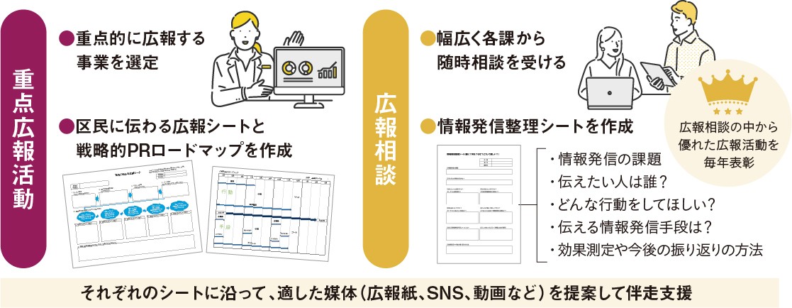 2つ目は、“広報相談”。重点広報以外の相談に幅広く対応するためのもので、広報シートを簡略化した“情報発信整理シート”を活用する。「シートを書くことで、担当者自身が、そもそもの事業の目的や、何のために情報発信をして、区民にどんな行動をしてほしいのか、といったことが整理できます」。