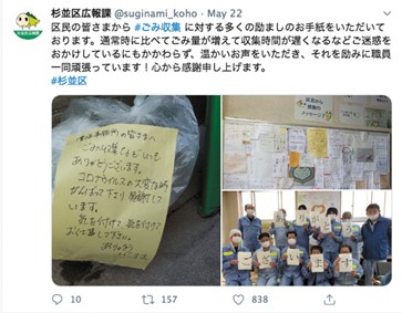 谷さんは庁内の優れた広報活動を表彰するPRアワードを立ち上げ、その結果を職員報で伝えている。令和2年度のSNS部門で受賞したのは、杉並清掃事務所の作業係が行った広報事例。緊急事態宣言下でごみ収集をする際、区民から感謝の手紙がごみ袋に貼られていたことに対し、“お礼の気持ちを伝えたいがどうしたらいいか”と、広報課に相談。感謝の言葉を書いた手紙を職員が持ち、自分たちで撮影した写真をSNSで配信したところ、多くの反響があったそう。「実際に私たちの情報が区民に伝わっていることを、庁内の職員も実感できたと思います」と、谷さんは今後も職員の積極的な広報活動に期待を寄せている。