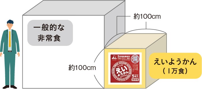 食品だけでなく水や衛生用品など、避難所には多くの備蓄が求められるが、備蓄スペースは限られる。えいようかんは一般的な非常食よりもコンパクトなスペースで備蓄可能で、1本当たり171kcal(ご飯小盛1杯分程度)のエネルギーを補給できる。強化段ボールに撥水コート仕様で長期備蓄も安心。多くの自治体で導入実績あり。