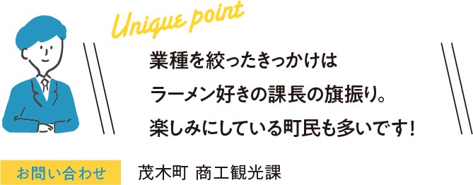 令和3年6月、「ラーメン屋求む」と書かれた空き家活用補助事業のチラシがSNSでシェアされ、瞬く間に多くの注目を集めた。10年前から中心市街地の空き家対策に取り組んできた茂木町。「役場の前に空き店舗を持つ大家さんからの『自由に使っていい』という提案がきっかけで、本町に1軒もなかったラーメン屋に絞った募集をしました」と担当者。これをきっかけとして、既存の空き店舗活用補助制度とは別に、「ふるさと起業家支援補助金」を創設して募集対象を絞ったという。このプロジェクトを率いたのは、自他ともに認めるラーメン好きだった商工観光課の課長、滝田さん。限定的な募集ながら、SNSでの反響もあり問い合わせが殺到し、当初の締め切りを1カ月早めたほどだ。その後、事業者が決定し、開店に向けて準備中だという。「メニューに地元産の食材を使用するなど、まちづくりにも協力的。新たな観光拠点になれば」と期待も大きい。