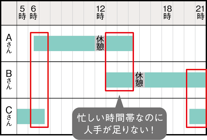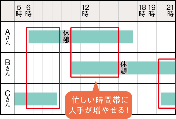 勤務時間の重なりが増えることで、1人当たりの担当業務が軽減される。休みも確保しやすい。