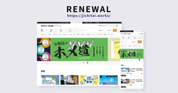 いつもジチタイワークスWEBをご覧いただきありがとうございます。 2025年10月26日、当ホームページをリニューアルいたしました。 リニューアルでは、皆さまにより快適にご利用いただけるよう、 各種機能とデザインの刷新を行いました。 これからも自治体職員の皆さんを“元気にする”コンテンツを豊富に揃えたメディアとして “仕事”から“暮らし”まで幅広く役立つ情報をお届けしてまいります。 今後とも、ご愛