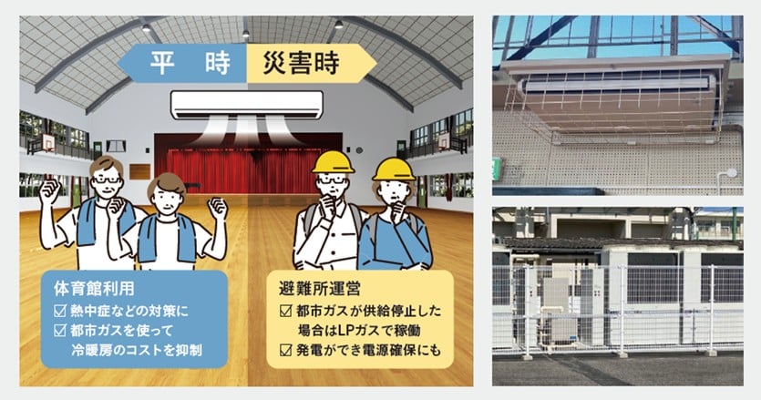 体育館空調を考える上で欠かせない、万が一の災害に備える防災の視点。 平時は都市ガスでコストを抑えて、停電時には自立運転で空調を提供。 地域の拠点となる体育館に、住民が元気に過ごせる環境を。 豊田市 左:教育委員会 学校づくり推進課 担当長 酒井 琢(さかい たくま)さん 右:教育委員会 学校づくり推進課 主査 加賀 裕章(かが ひろあき)さん 暑さ対策のため、すでに小・中学校の全教室に空調を設置し